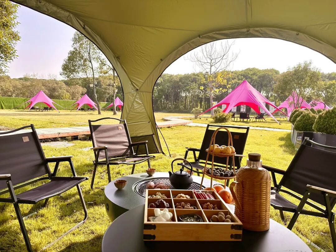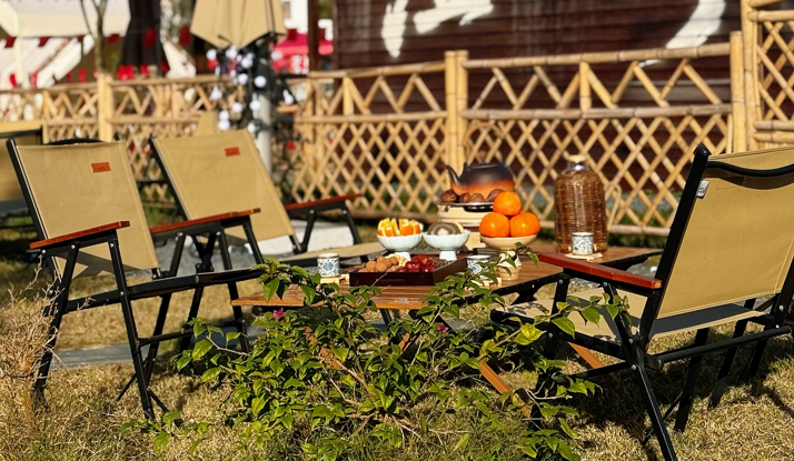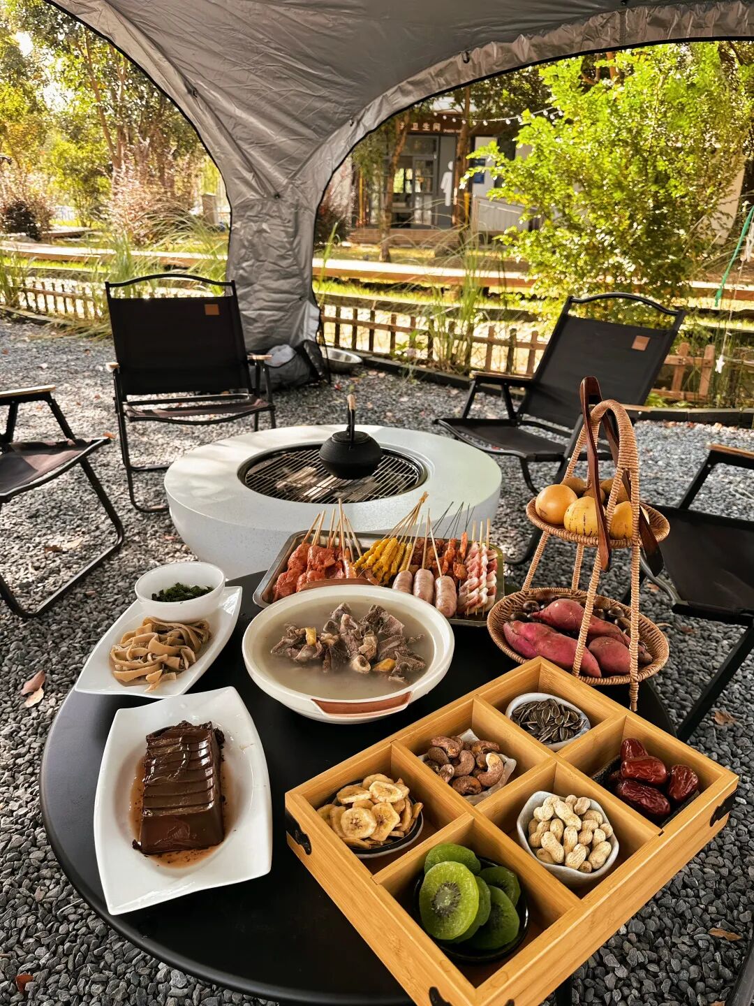 在这里,你可以和三五好友围坐,在露营风帷幔的轻拂下,翻书品茶,看炭火明灭间食物慢慢变熟;也可以陪家人闲话,让围炉烟火点亮你冬日的温暖时光。日落时,庭院小彩灯亮起,星光与灯火在茶汤里摇晃,这一刻,城市喧嚣都成了过眼云烟,只剩下围炉的暖意、食物的烟火和岁月的静好。