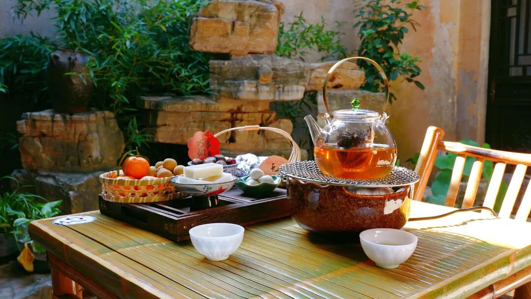 步入茶馆天井,又是另一番闲适景象,围炉煮茶的惬意便在鼻尖与舌尖蔓延开来。四仙台与竹椅矮凳错落排开,中间的炉火上,壶中茶水正“咕嘟咕嘟”冒泡,一缕缕醇厚茶香袅袅升起,与枣香缠绕交织在一起,酿成沁人心脾的暖香。