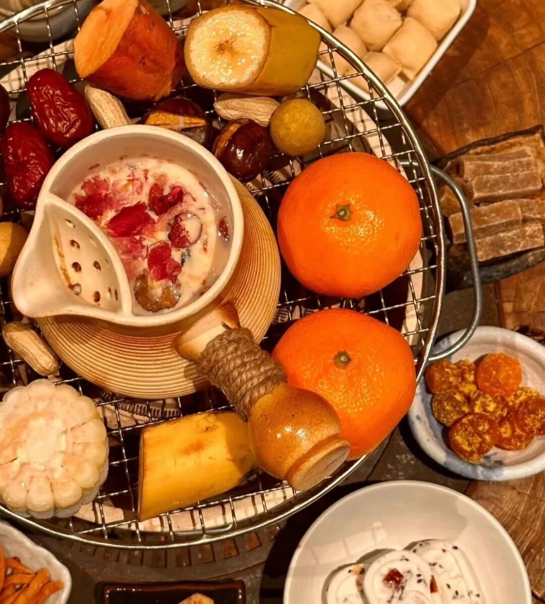 踏入浪漫庭院,露营风桌椅旁的围炉正炭火熊熊。陶壶里,玫瑰与鲜奶咕嘟出粉嫩的绵密茶汤。炉上的“小世界”更是诱人,红薯金黄绵甜,香蕉段软绵如蜜,橘子橙红鲜亮,还有红枣的甜糯、花生的酥脆、板栗的绵密,与一旁碟子里的蜜饯、糕点相映成趣,每一样都是炭火与时间共酿的冬日美味。
