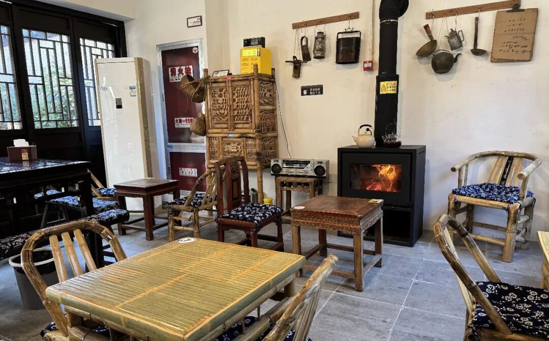 推开茶馆古朴的木门,四仙台、八仙台与老式碗橱即刻映入眼帘,满是古朴雅致的韵味。墙上悬挂的铜勺、煤油灯等老物件,正向来往的茶客们默默诉说着江阴的故事。待壁炉中炭火冉冉升起,香樟木的清香在屋内缓缓弥漫,滚热的开水冲开茶叶,抿上一口满是回甘,冬日的暖意瞬间填满心房。
