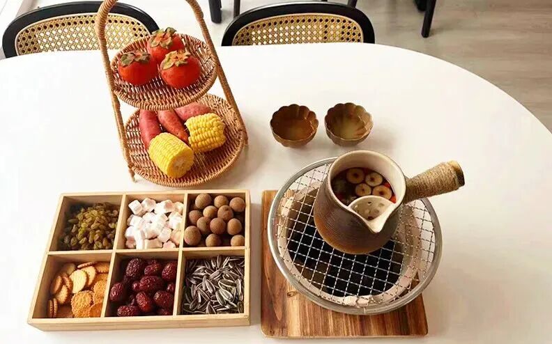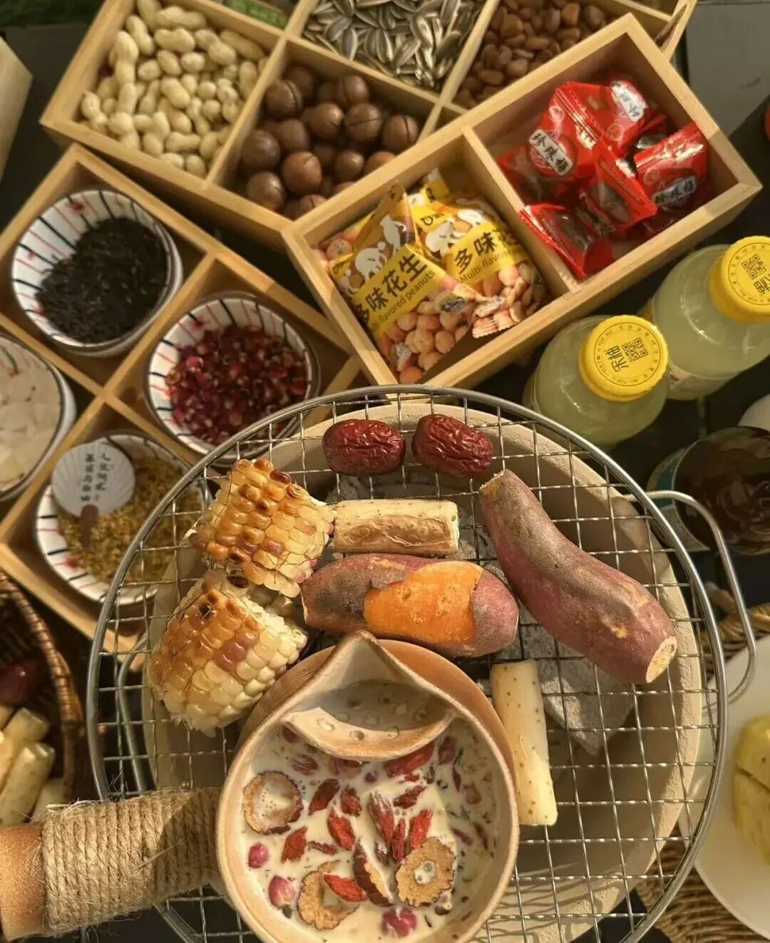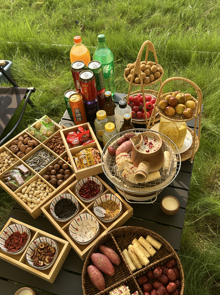 除了热茶,炭火慢烤的美食更是不容错过。甜玉米经过耐心烘烤,外皮微焦,咬上一口,汁水在口中爆开,清甜的滋味让人回味无穷。糖心蜜薯在炭火中煨至金黄,剥开外皮,金黄的糖浆缓缓流淌,软糯香甜的口感,每一口都是满满的幸福感。还有棉花糖,在火上烤到微焦,轻轻一拉便能拉出长长的丝,甜而不腻。搭配上精心准备的坚果小食盒,坚果经过炭火微微烘烤,香气四溢,一口坚果一口茶,惬意十足。