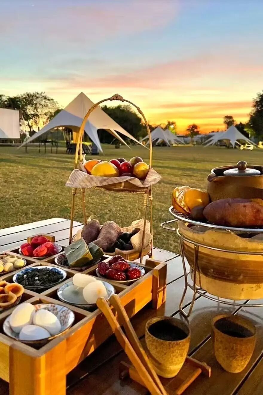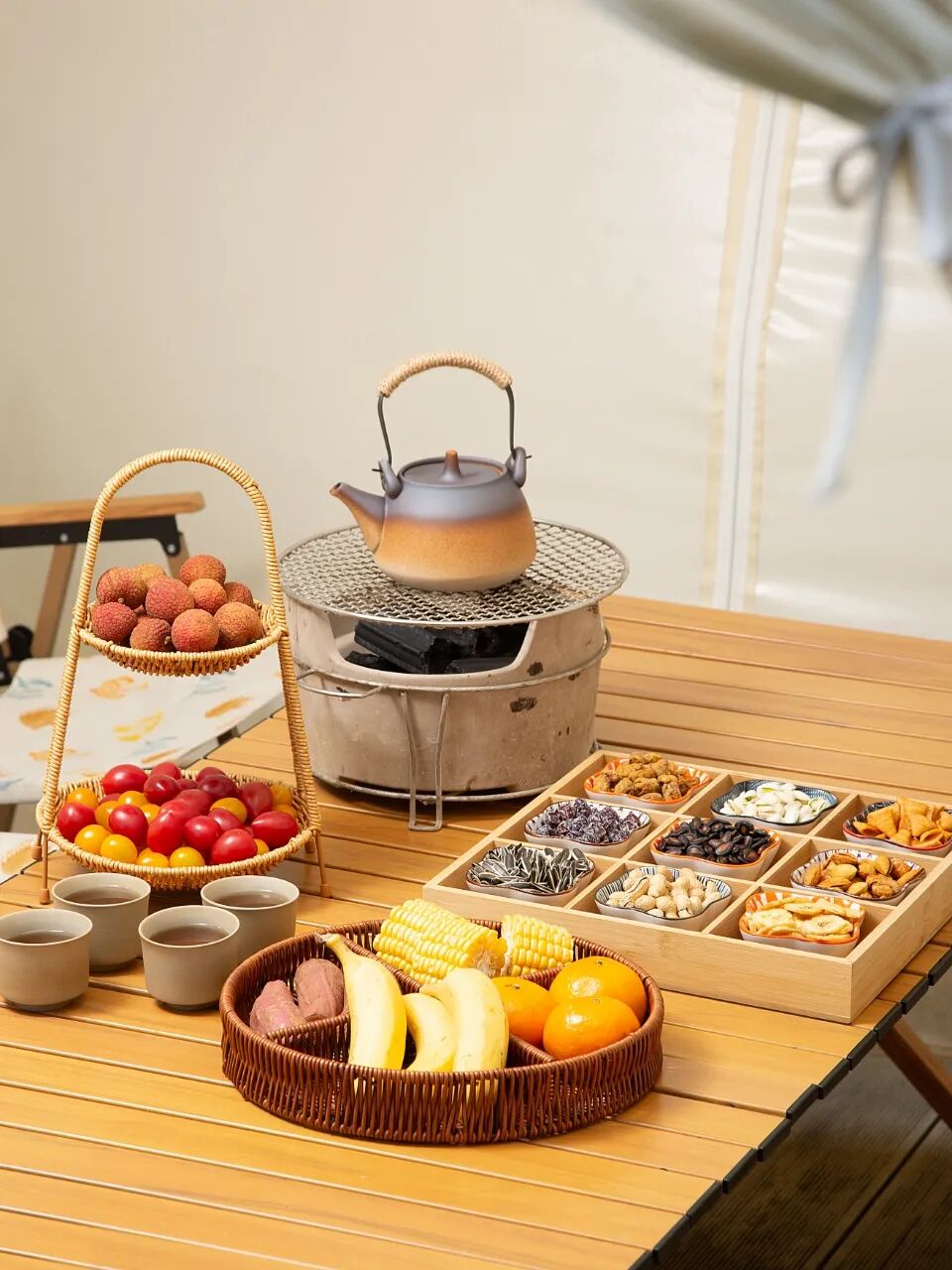 玩累了,就在“稻田里”支起一方小炉,让田园诗意与烟火美味在炉边共舞。陶制茶壶在炭火上咕嘟作响,茶汤渐浓时,琥珀色的茶水注入粗陶杯,茶香瞬间在稻田的清冽空气中弥漫。炉边的竹制托盘里,荔枝、小番茄鲜润欲滴,烤得金黄的玉米、红薯散发着甜香,九宫格的坚果、果干错落有致,每一口都是酥脆与香甜的碰撞,在暖手的茶杯旁,织就松弛的午后时光。