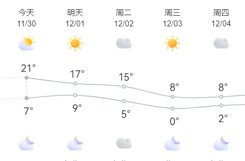 预计今年12月平均气温全省大部分地区较常年偏高0~1℃。月极端最低气温淮北地区-9~-6℃,其余地区-6~-4℃。