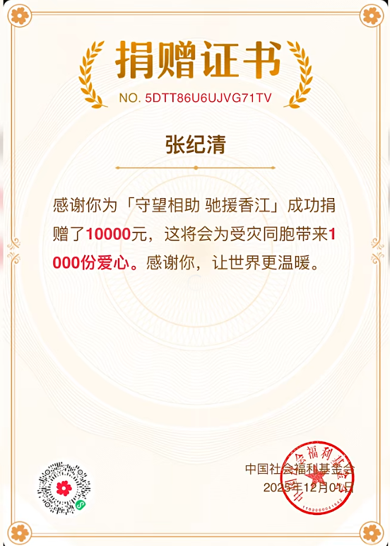 张纪清是江阴一名普通退休职工,自1987年起化名“炎黄”,向全国各地捐款捐物,直至2014年因一次汇款意外被媒体报道,其善举才广为人知。此次得知香港灾情后,他第一时间与家人商议,决定捐出1万元支援香港同胞。“香港同胞遇到困难,我们总要表达一份心意。守望相助是中华民族的优良传统。”张纪清表示。