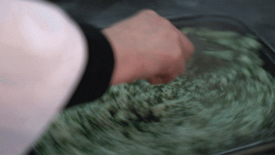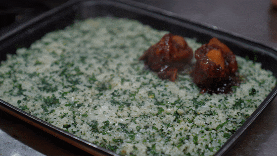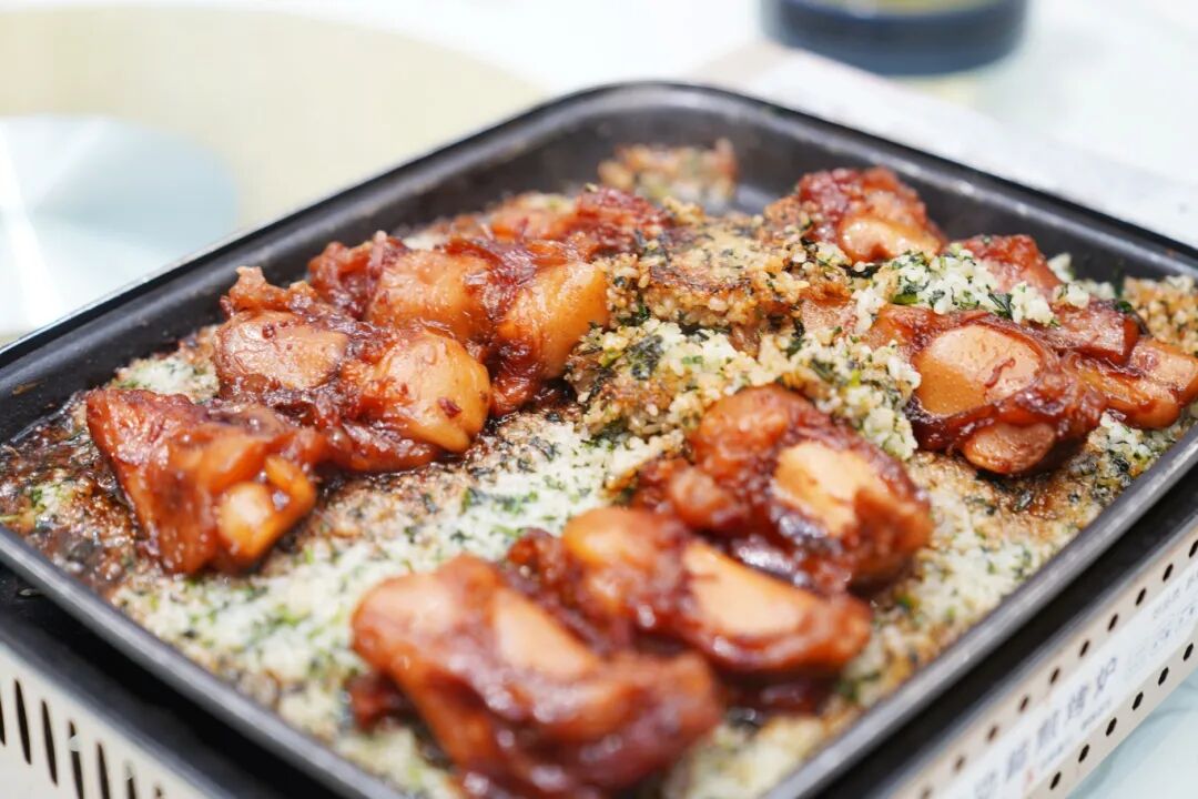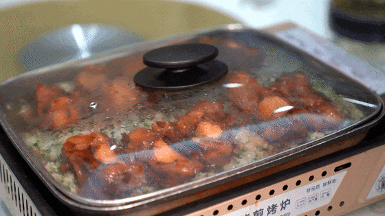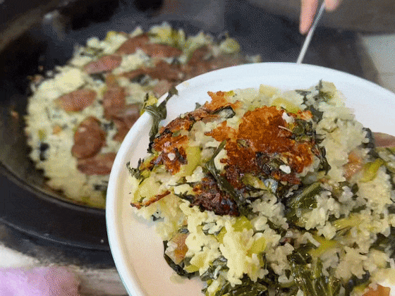 先把新鲜的荠菜焯水后切碎,放入油锅炒至断生,接着放入提前准备好的米饭一起翻炒,然后将荠菜咸饭放入卡式炉的烤盘压实,最后在上面放上提前用秘制香料卤制好的元宝骨,将卡式炉开火接着烹制一会儿,等烧出锅巴后即可关火开吃。