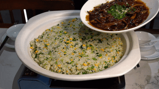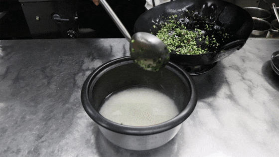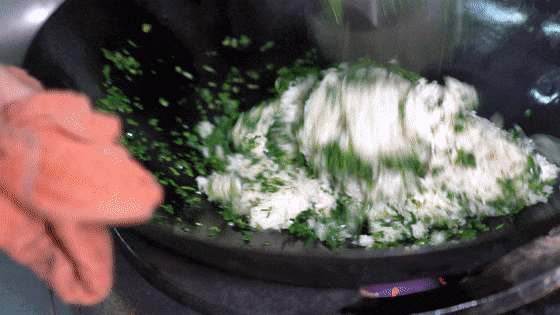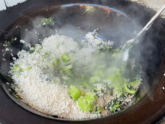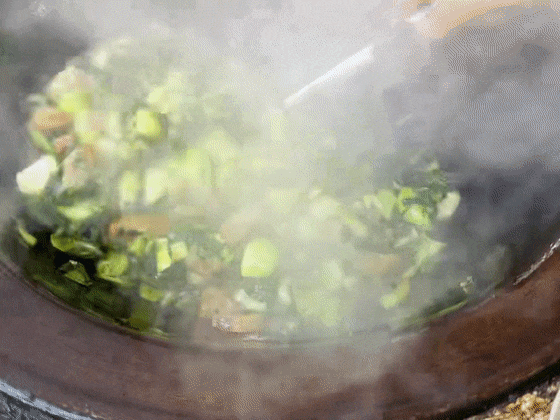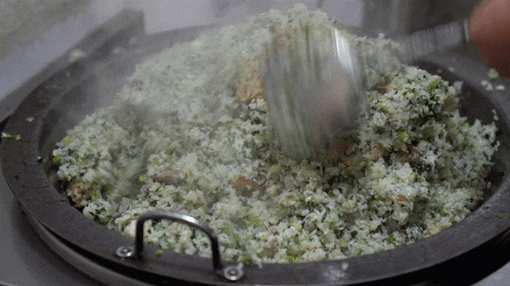 接着做快手版咸饭。在锅中放入猪油,待油化开后放入青菜和提前炒制好的鸡蛋一起快速翻炒,待青菜断生后放入米饭大力翻炒,在热油中吸收香气。米粒在锅中被炒得晶莹剔透,每一颗都带着热腾腾的光泽,散发出诱人的味道。最后调味,盛入砂锅,将咸饭在砂锅中压实,放上卡式炉,为下一步烹制做好准备。