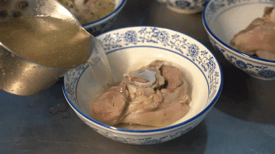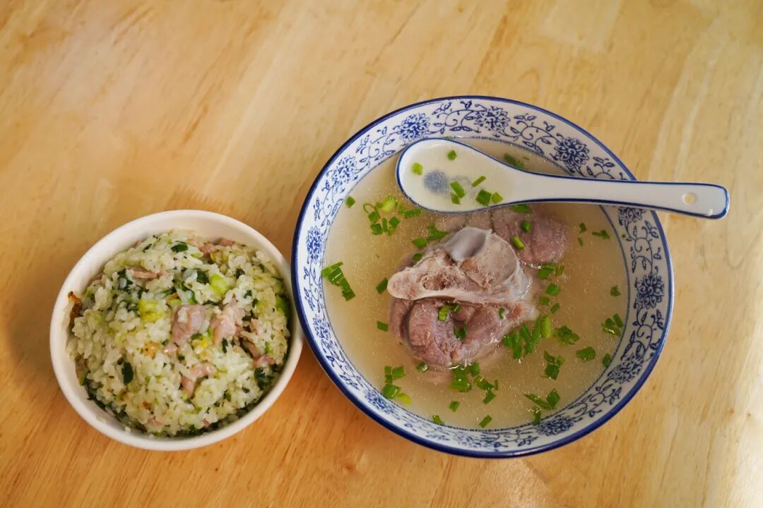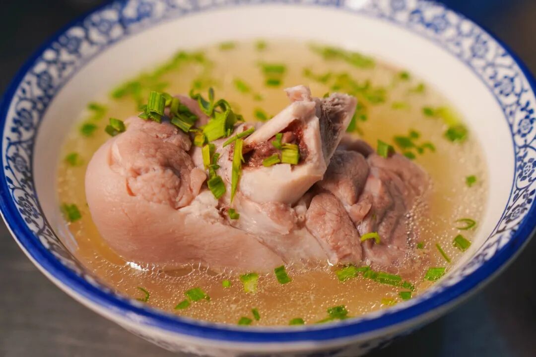 而这碗鲜肉咸饭的最佳搭档就是美味斋的另一个招牌咸脚圈。每天清晨,老板把刚买回来的猪脚圈提前用薄盐腌一下,和鸡架一起放入锅中,接着放入葱姜、料酒炖煮,2个小时左右,脚圈肉质软烂,高汤也煮好了。顾客点单后,拿个青花大碗,从锅里捞出一块提前炖煮好的脚圈,洒上大蒜叶,然后浇上一勺热腾腾的高汤,与咸饭搭配一起吃,真是十分满足的一餐。