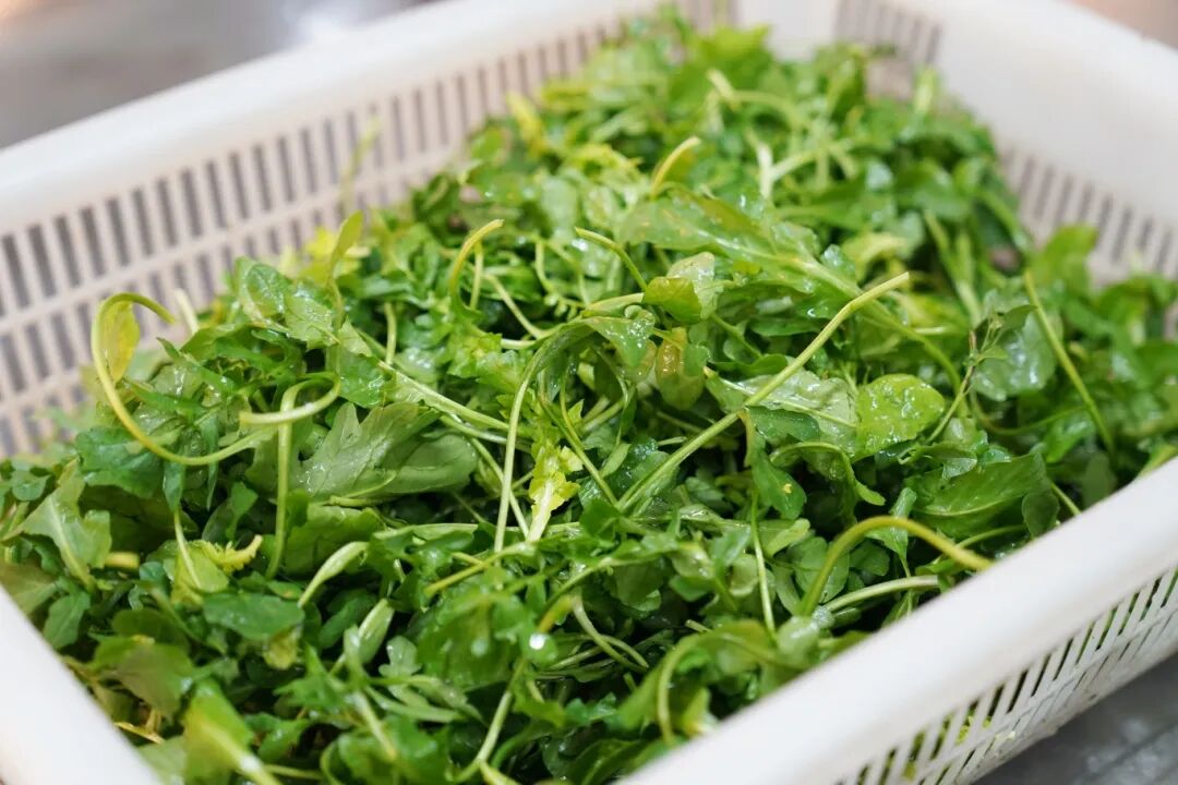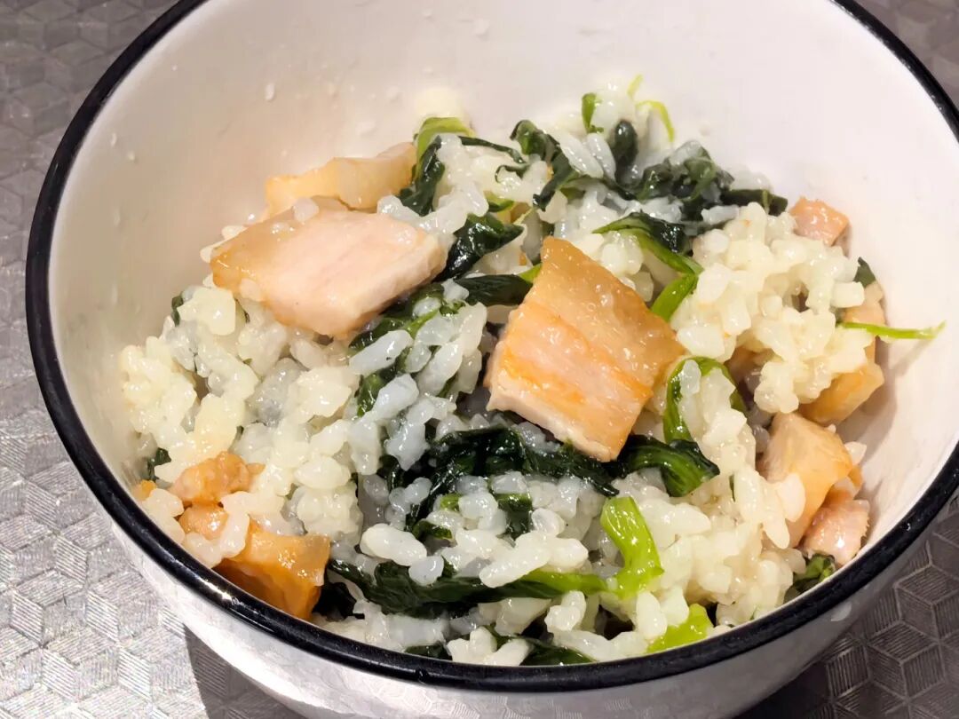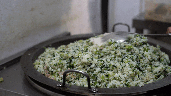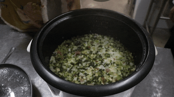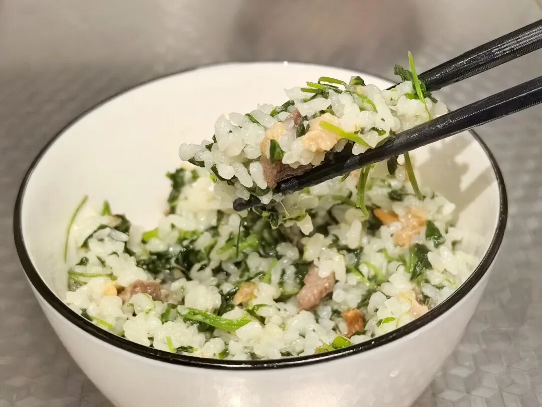 除了大青菜咸饭,江阴人还会根据时令更换其中的蔬菜,莴笋叶清爽,荠菜鲜美,茼蒿清甜,任君选择。