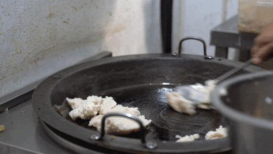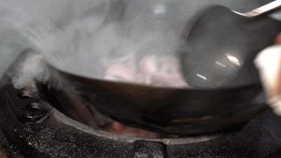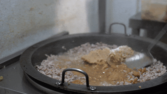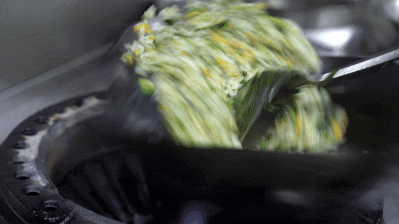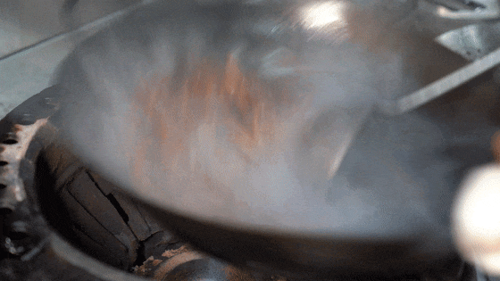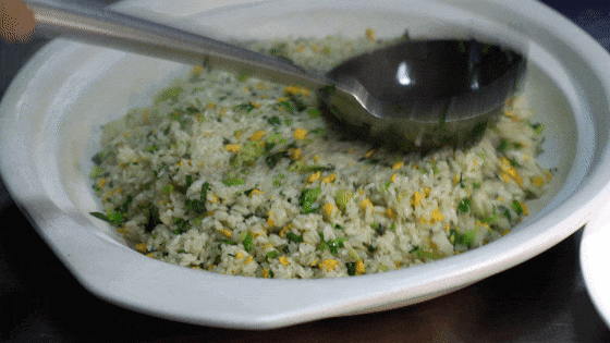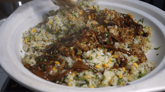 最后将响油鳝糊倒到咸饭上,开火烧一会儿,等听到咸饭噼里啪啦地产生香味,把鳝糊和咸饭简单拌匀就可以开吃了。一口下去既有咸饭的鲜香,又有鳝丝的鲜甜滑润,这个创新组合让咸饭的美味上升到了新的高度。