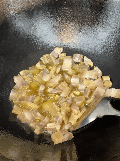 先将铁锅烧热,倒入菜油,烧至起烟后倒入咸肉,咸肉煸香至出油脂、边缘泛金黄;然后将处理好的青菜倒入锅中翻炒至断生,加少许盐调味;接着加入淘洗干净的大米,放入适量清水,水量刚好浸没过饭菜即可,加盖闷煮20分钟就可以出锅了,柴火在灶膛里噼啪作响,火苗热力均匀地传递,咸饭被慢慢焖熟。如果你喜欢吃锅巴,还可以多焖一会儿。