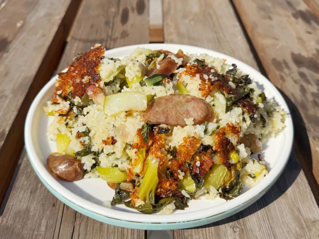 掀开锅盖的瞬间,肉香菜香饭香一下子充盈了灶间。菜叶虽然不绿了,但柴火灶咸饭的滋味依然能打。霜打菜的清甜、咸肉的醇厚、米饭的软糯,还有柴火的烟火气,都在舌尖交织,还来不及细细品味就已经一碗下肚。