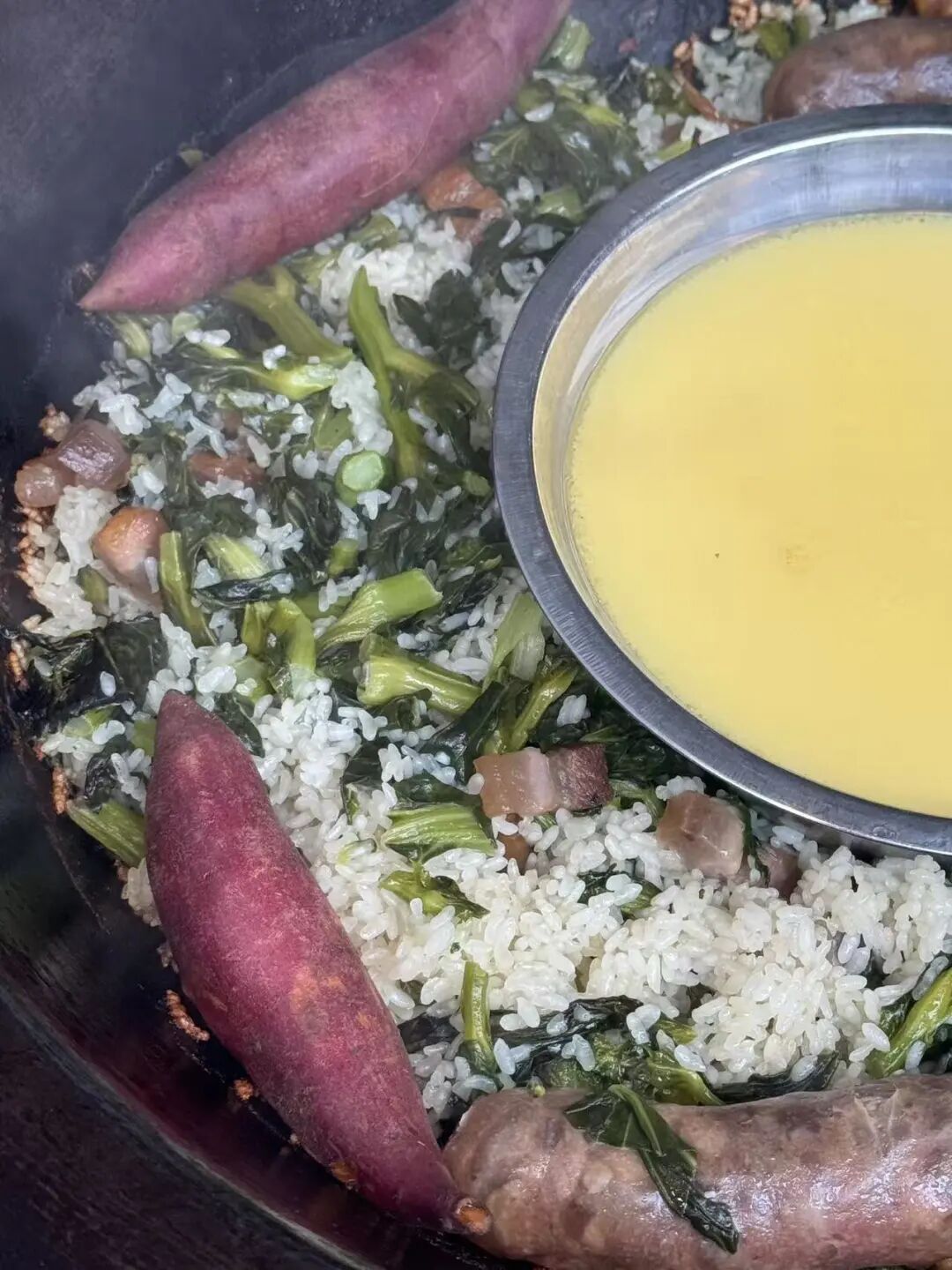 味道纯正的咸饭自然得用柴火灶来烧。南国小院的咸肉菜饭就是用柴火灶烧出来的,是冬季限定,只有天冷了才会有,等着就是那一把清甜的霜打菜。