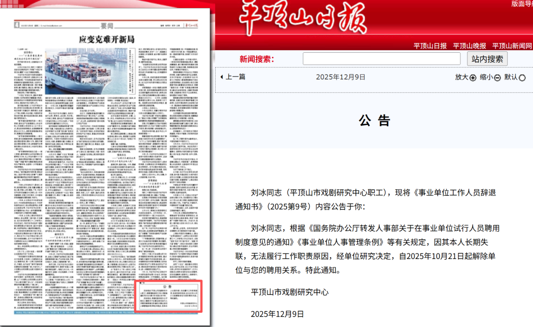刘冰同志(平顶山市戏剧研究中心职工),现将《事业单位工作人员辞退通知书》(2025第9号)内容公告于你: