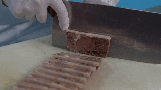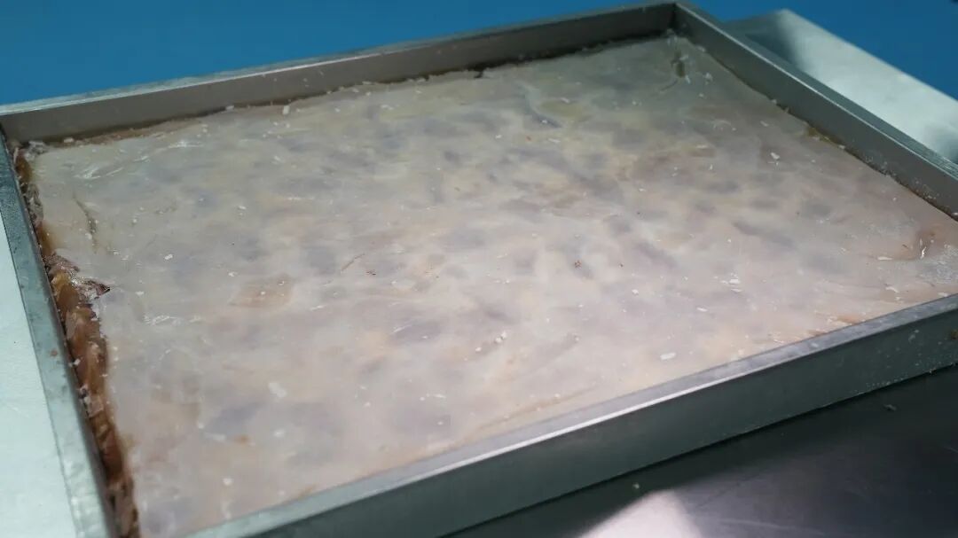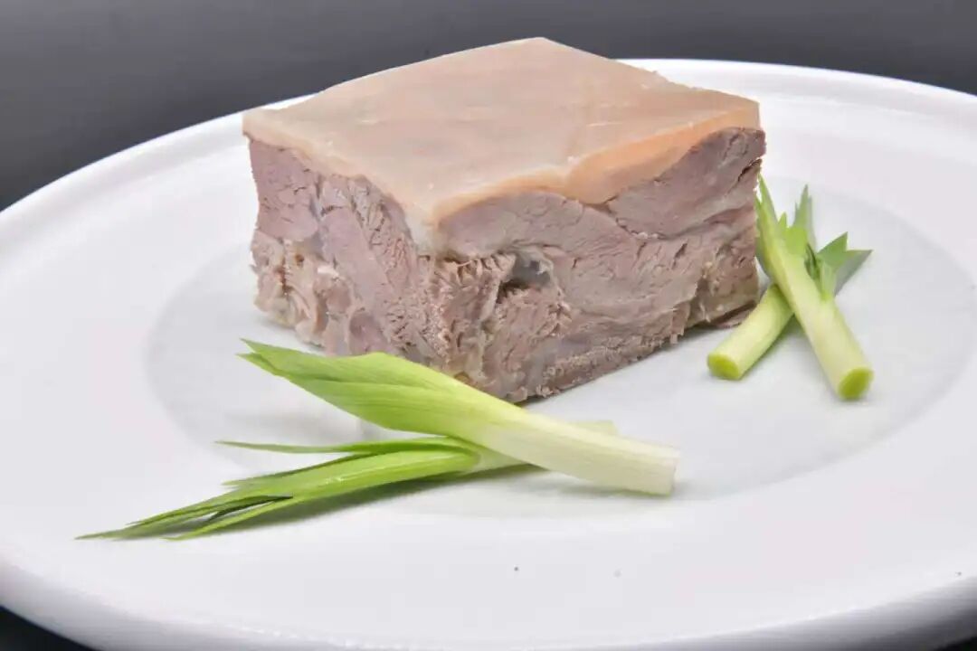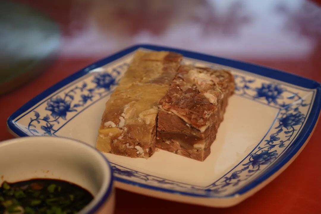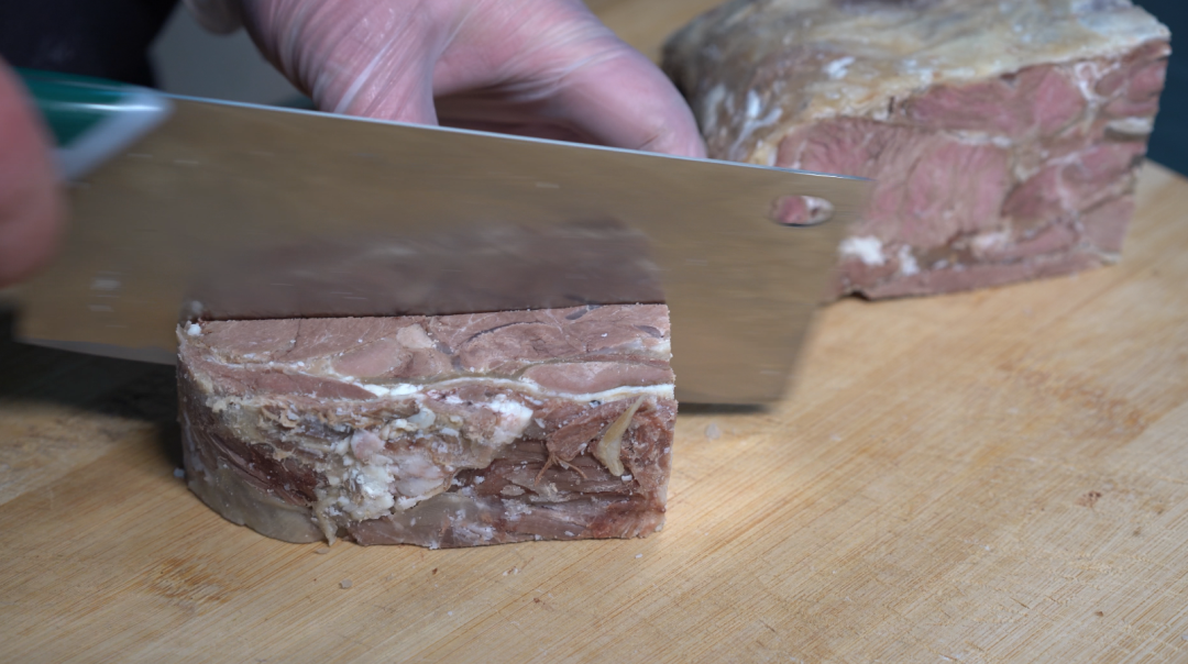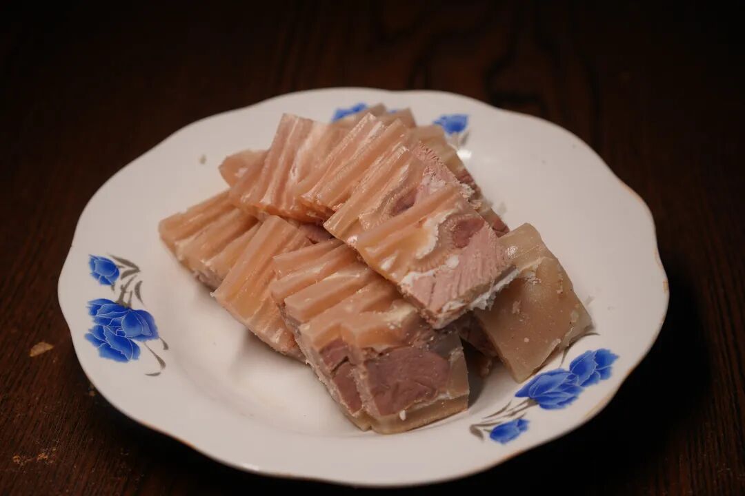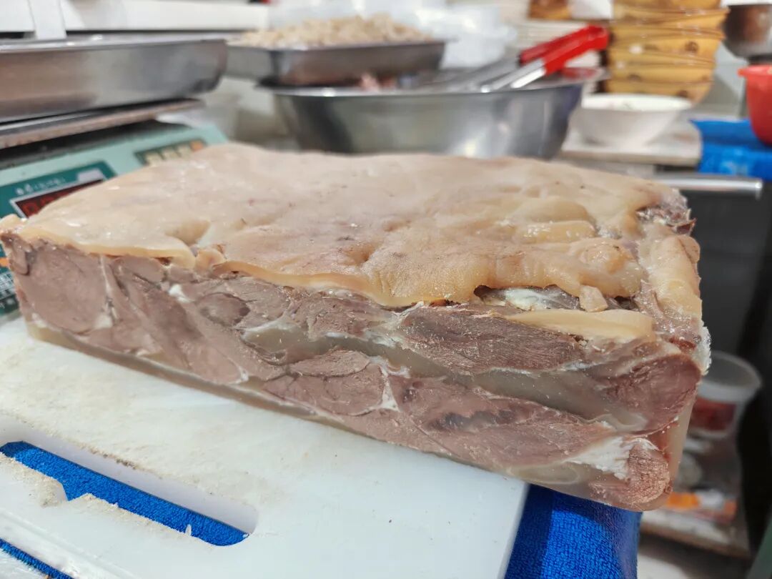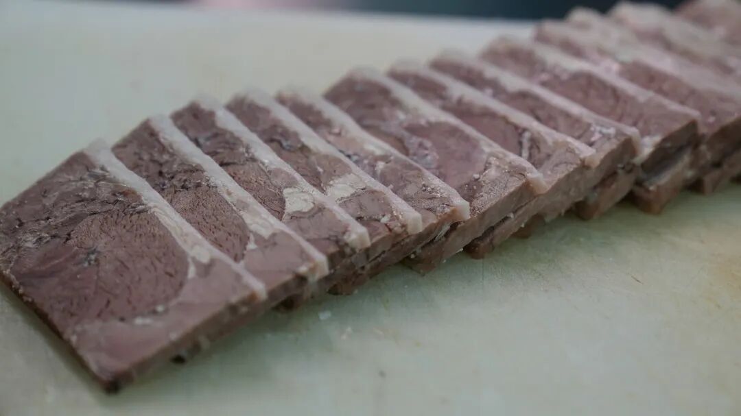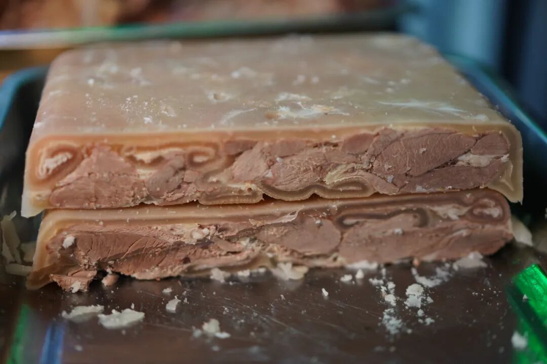 紧接着将处理好的羊肉层层码进特制模子,每铺一层,便均匀浇上一勺浓白羊汤;最上层覆盖一张完整的熟羊皮后,再压上厚重的青石板。此时,冬日的低温成了天然“冷库”,模子中的羊汤逐渐凝固,将层层羊肉紧密粘合,最终形成一整块色泽红亮、肌理清晰的“羊肉板”。
