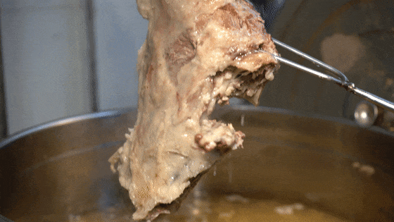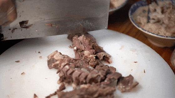 煮透后趁热拆去骨头、刮净羊油,一斤鲜羊去骨、去皮、去油后,最后只剩四两半精华。全部弄好后,就把处理好的羊肉装入专用的布袋,一只羊的肉刚好塞满一个布袋。压肉更是讲究“硬碰硬”,装入羊肉的布袋呈长方形形状,随后在其上方压上90斤重的石头。羊肉要压足两三个小时,这样肉才能凝结得紧实弹牙,天冷可稍减些时间。压好后静置两小时,这样就大功告成了。
