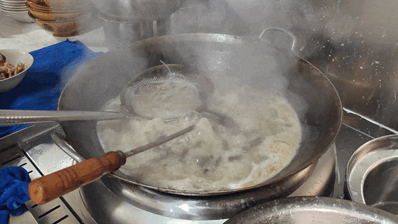 食材上,店家坚持选用如皋本地散养山羊,这种山羊肉质紧实、膻味极轻,是熬汤的上乘之选。羊汤底经过三小时慢火细熬,羊肉在慢炖中充分释放其鲜味,美味被牢牢锁在汤底中。最终熬出的羊汤浓度醇厚、香气馥郁,汤色乳白如奶,浓度醇厚挂勺,尽显羊肉的鲜美精髓。