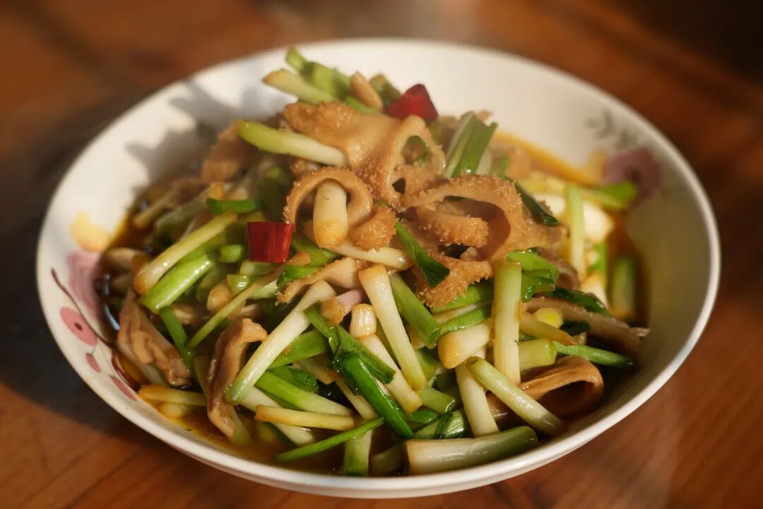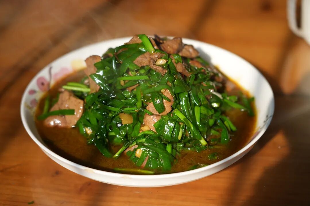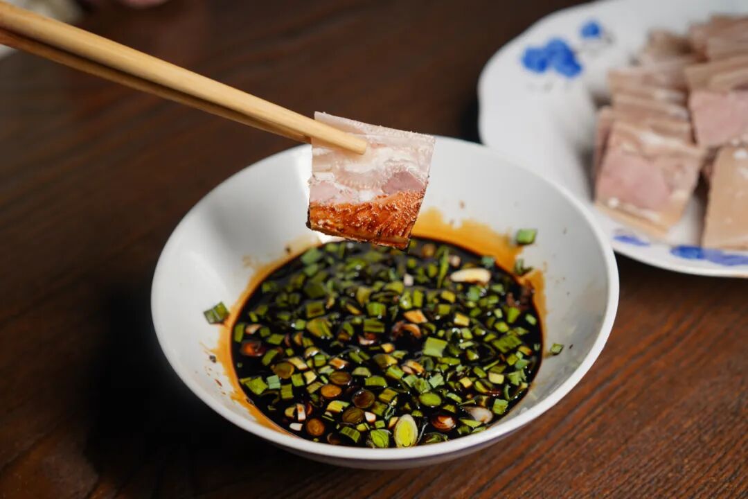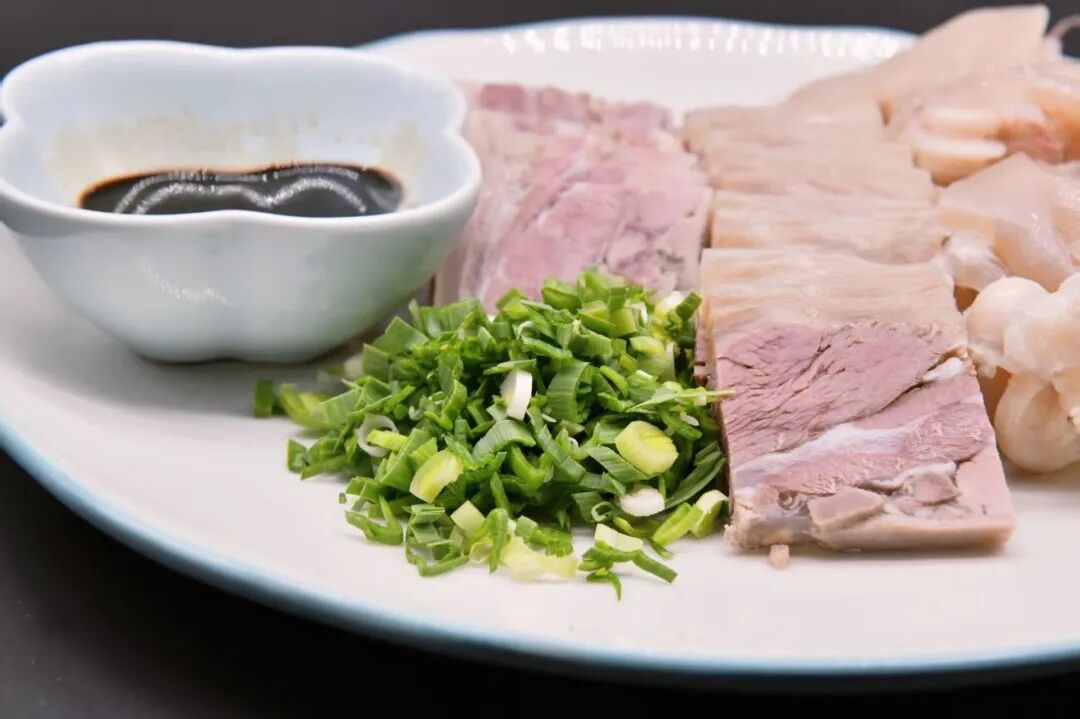 食用时,顺着羊肉纹理切片,每一片都带着完整羊皮,肥瘦相间、油润光亮,尽显压板羊肉的地道本色。而吃压板羊肉,绝不能少了两样“黄金搭档”,一把切碎的新鲜大蒜叶,半碗醇厚的华士酱油。夹起一片羊肉,蘸上些许酱油送入口中,先是羊皮的Q弹软糯,紧接着是羊肉的紧实口感,随后肉香与酱香交织,不仅没有掩盖羊肉本身的鲜味,反而让风味更富层次,暖意缓缓在胃里扩散。