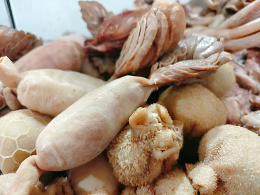 店门口的案板擦得锃亮,刚出锅的羊肉、羊杂被切得整整齐齐码在上面,羊肉肥瘦相间,羊肚纹理分明,羊血凝得紧实。食客们围着案板挑拣,选好的羊肉、羊杂或拌上秘制的酱料直接吃,或再回锅煮进汤里。