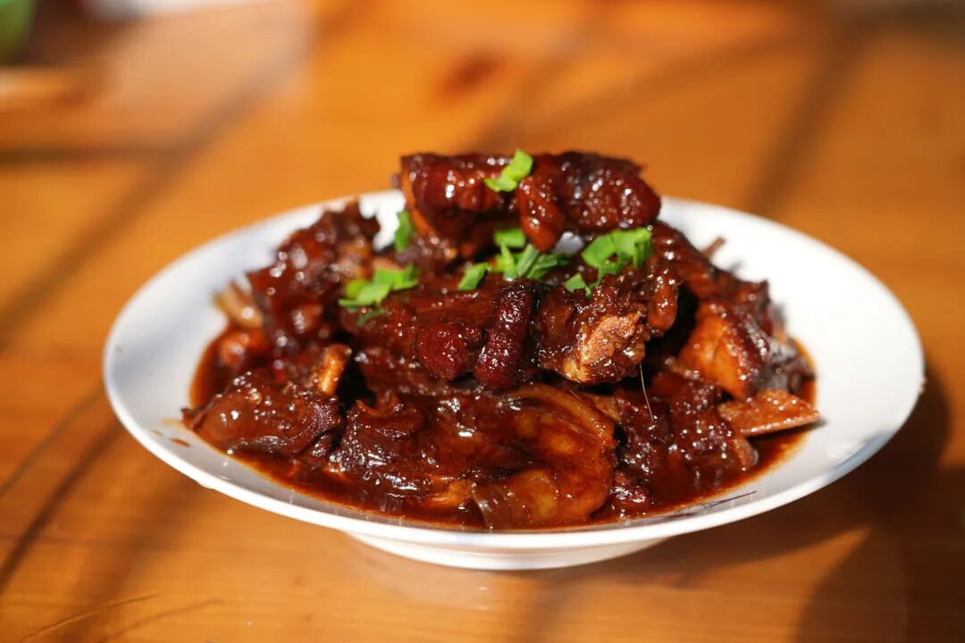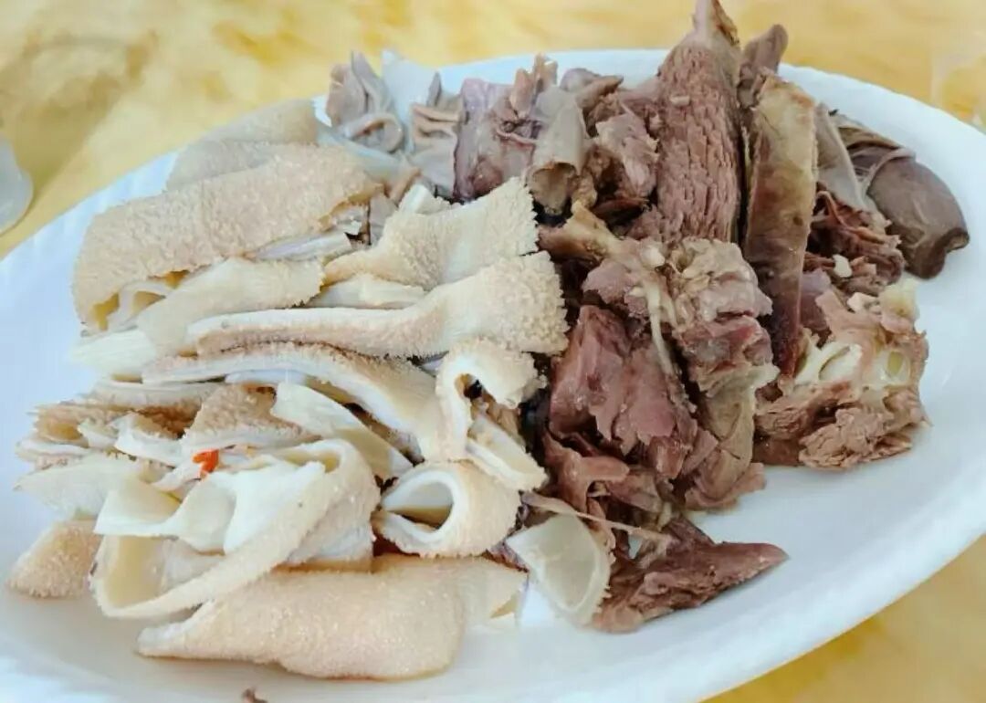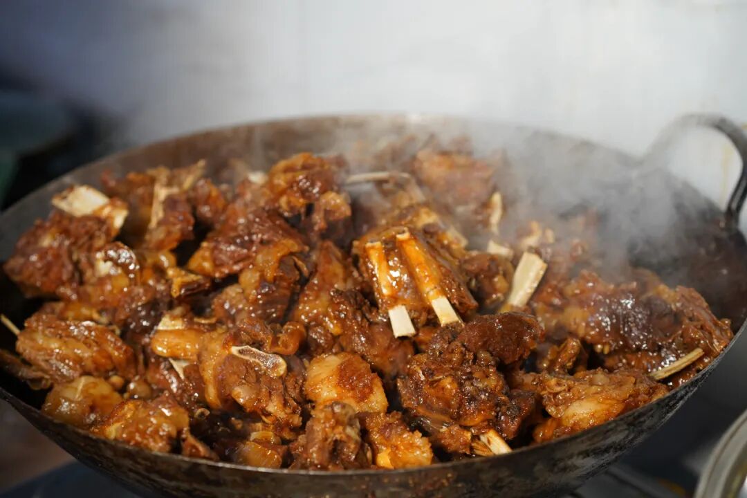 转身看灶头的大铁锅,红烧羊排焖得油光锃亮:酱汁收得裹紧肉骨,深棕色泽里泛着焦糖般的油润,衬得肋排肉愈发肥美,极为诱人。而案板上的新鲜羊肉更是馋人,刚片下来的羊肉粉里透红,肉缝里还浸着汁水;旁边大盆羊杂裹着薄润油光,粉白的羊肚、嫩红的羊肝.……还冒着蒸汽,带着鲜香气直钻鼻腔。