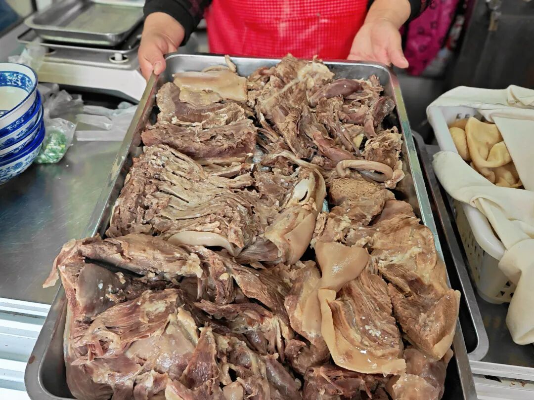 霜降前后,店里就开始忙碌起来。平日里一天要卖四五只羊,到了冬夜,忙起来要备上四五十只,才能赶上食客们的热盼。做压板羊肉,得跟时间抢鲜。凌晨三点,灶火就得亮起,鲜羊入锅慢煮三四小时,火候差一分都不成,这也是锁住鲜味的第一关。