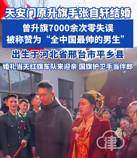 近日,中国人民解放军仪仗大队国旗护卫队原升旗手张自轩在自己的账号发文,他结婚了。