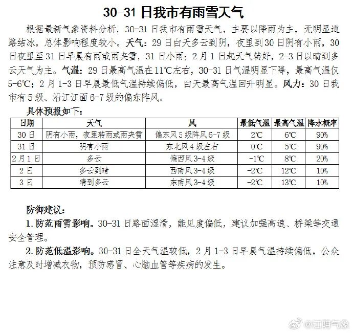 30-31日我市有雨雪天气