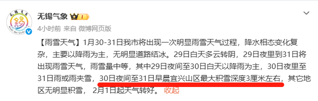 宜兴山区最大积雪深度3厘米左右