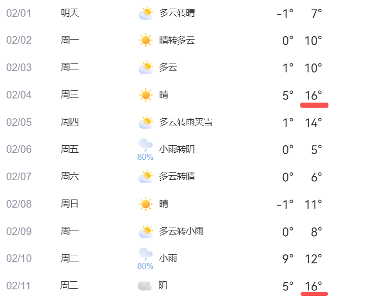 全省晴到多云。最高温度:淮河以南地区11℃左右,其他地区9~10℃;最低温度:苏南南部地区0~-1℃,其他地区-2℃左右。全省偏西风转偏东风,风力都是4级左右。