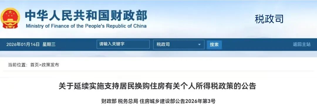 一、自2026年1月1日至2027年12月31日,对出售自有住房并在现住房出售后1年内在市场重新购买住房的纳税人,对其出售现住房已缴纳的个人所得税予以退税优惠。其中,新购住房金额大于或等于现住房转让金额的,全部退还已缴纳的个人所得税;新购住房金额小于现住房转让金额的,按新购住房金额占现住房转让金额的比例退还出售现住房已缴纳的个人所得税。