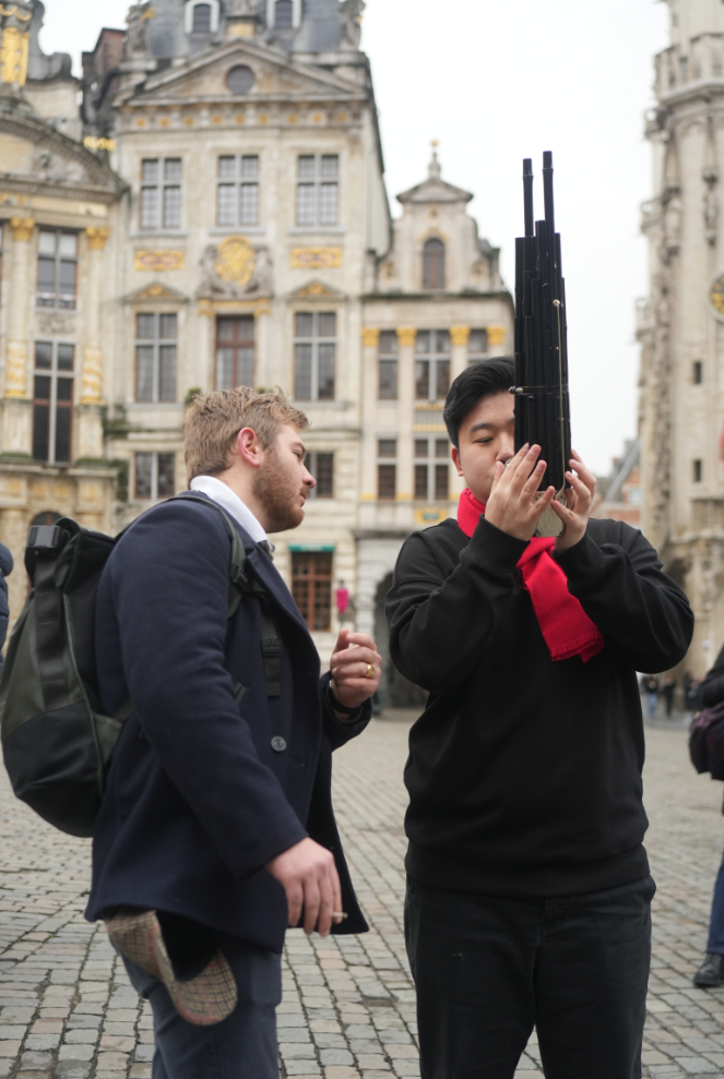 青年演奏家羊紫羽和任相池在布鲁塞尔漫画墙街头,仅通过笙和笛子两种乐器就把这首比利时名曲生动演绎出来。