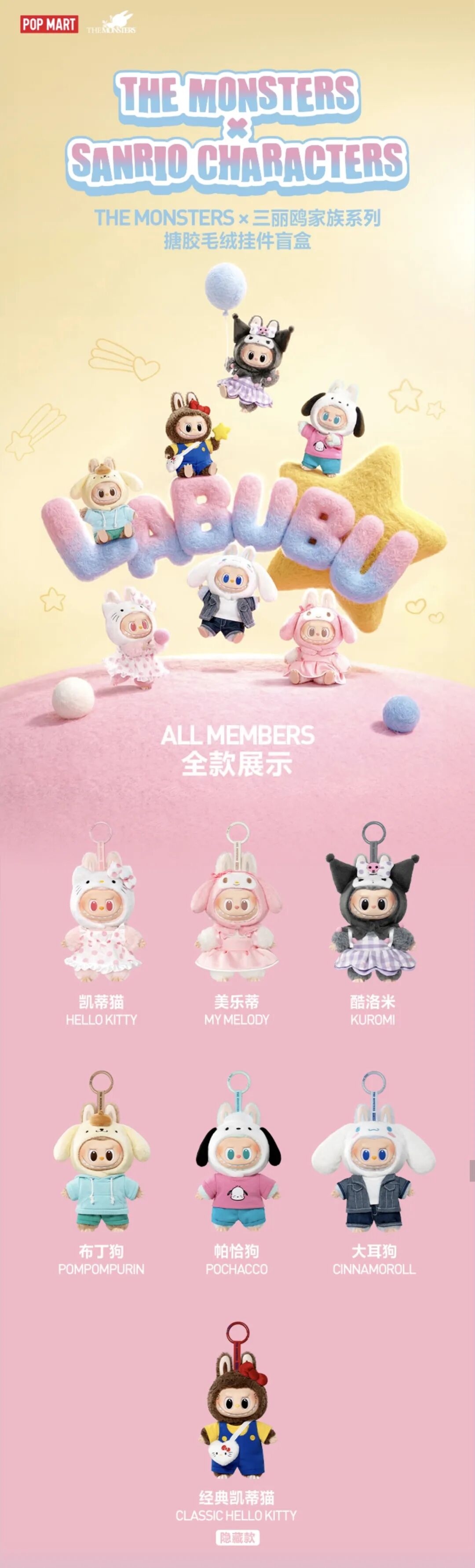 据悉,此次LABUBU联名三丽鸥盲盒共推出7款角色,含6款普通款与1款隐藏款,设计上以LABUBU经典造型搭配凯蒂猫、库洛米、美乐蒂等三丽鸥经典IP的专属服饰,单个盲盒售价159元,整盒定价954元,其中隐藏款出现概率为1:72,线下门店3月13日正式上架。