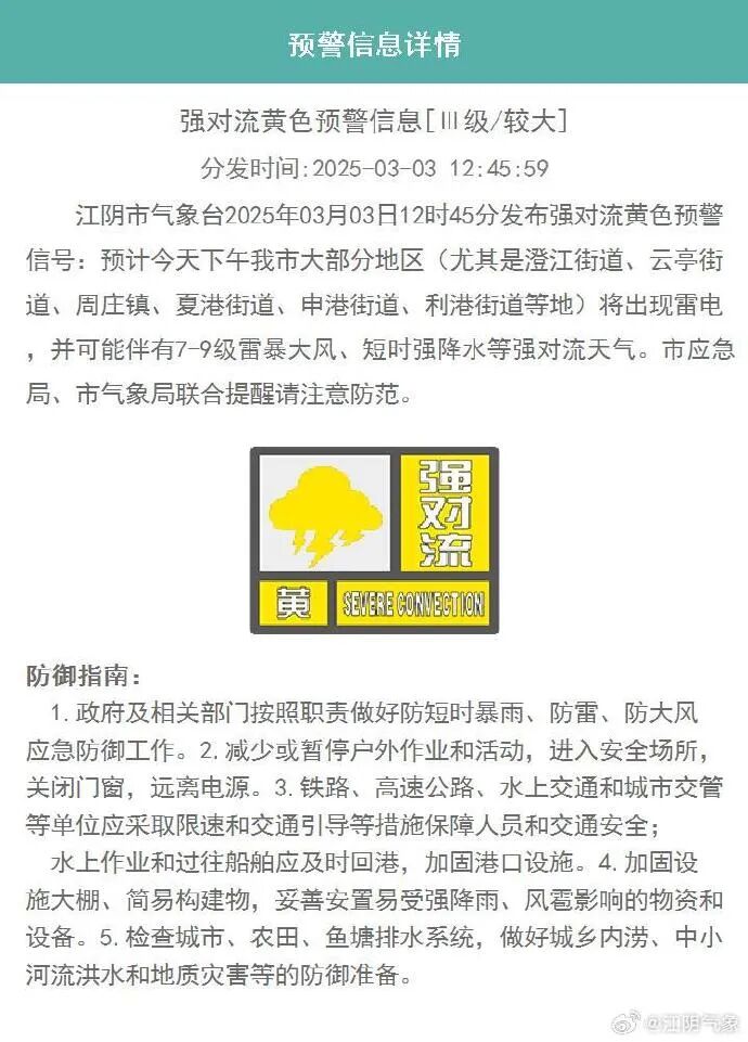 刚刚江阴打雷啦!!!江阴市气象台今天中午12时45分发布强对流黄色预警信号,预计今天下午我市大部分地区(尤其是澄江街道、云亭街道、周庄镇、夏港街道、申港街道、利港街道等地)将出现雷电,并可能伴有7-9级雷暴大风、短时强降水等强对流天气。请注意防范。