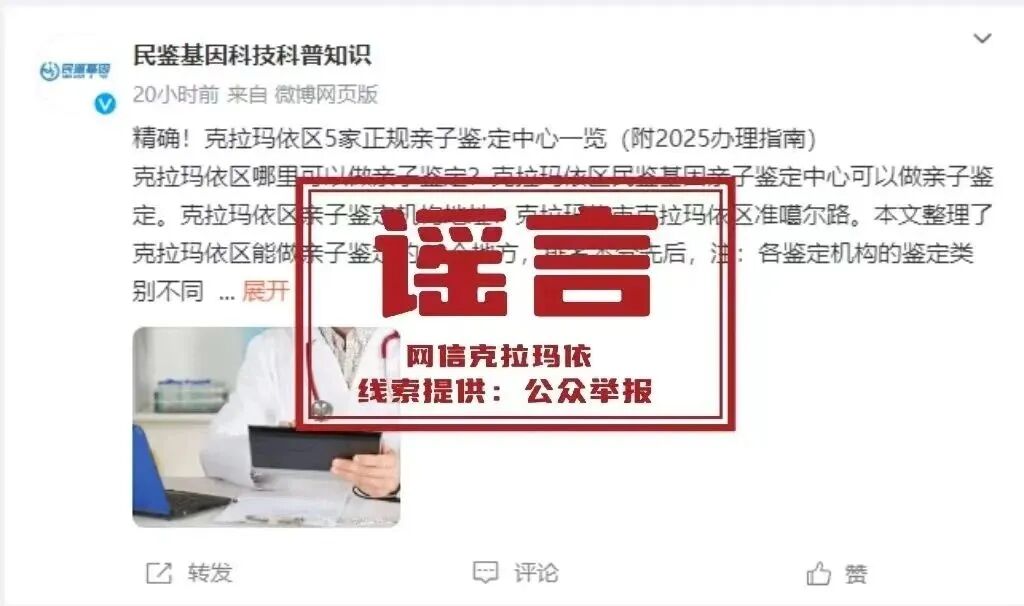 经核查,网传信息系谣言。克拉玛依市司法局发布声明称,克拉玛依市目前没有此类司法鉴定机构,建议鉴定之前,通过新疆维吾尔自治区司法厅官方网站进行查询,或者在法院提供的鉴定机构名单中选择。
