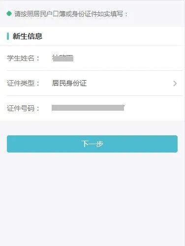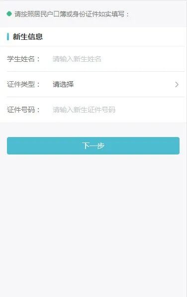 2.进入新生信息填写页面,输入新生的姓名、证件类型、证件号码。