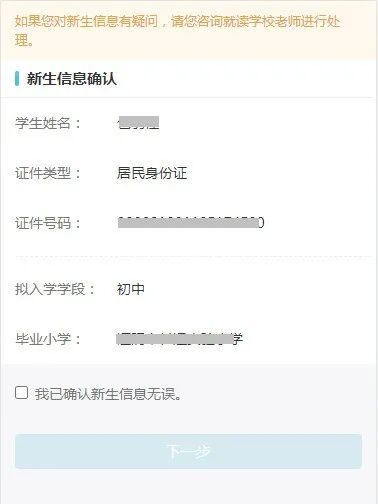 3.点击【下一步】后再次确认新生的信息,包括基本信息和拟入学学段等信息。