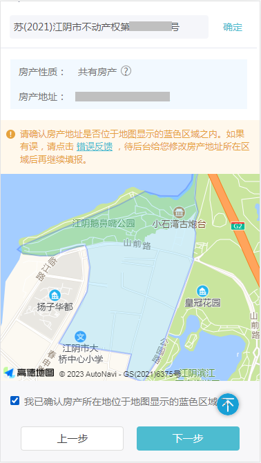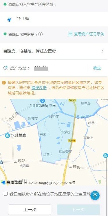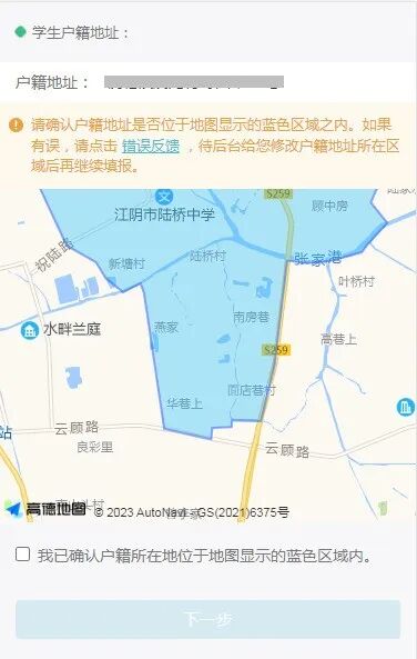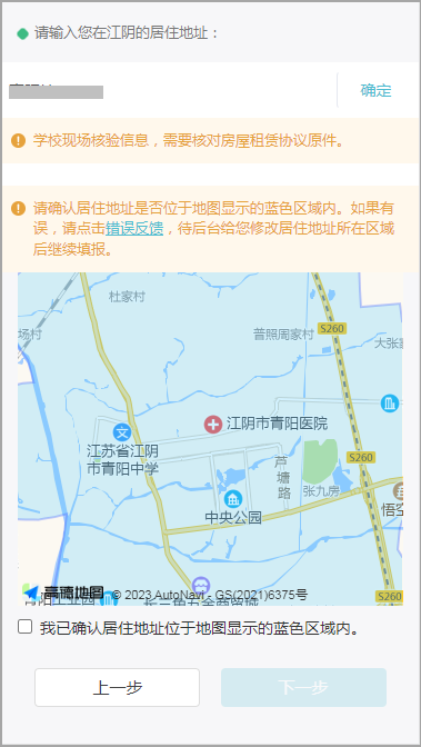 确认户籍地址位于地图显示的蓝色区域之内,确认无误勾选后进入【下一步】,如果有误,请点击【错误反馈】,待后台修改户籍地址所在区域后再继续填报。