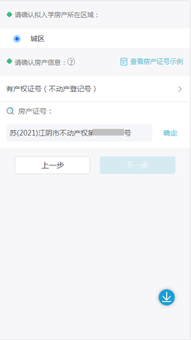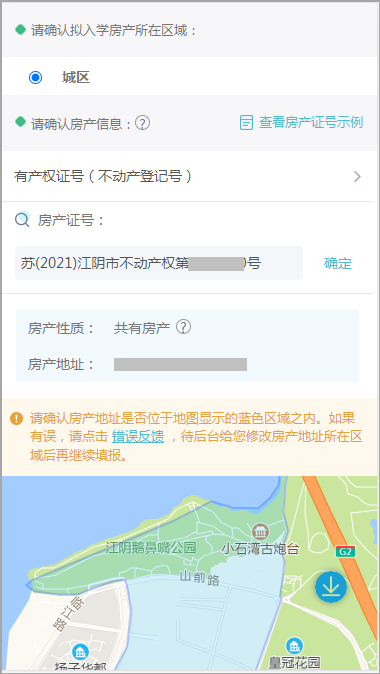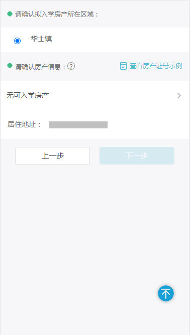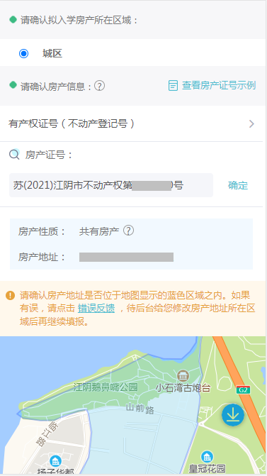 有房产时输入房产证号并确认房产地址是否位于蓝色区域之内;无房产时输入居住地址。