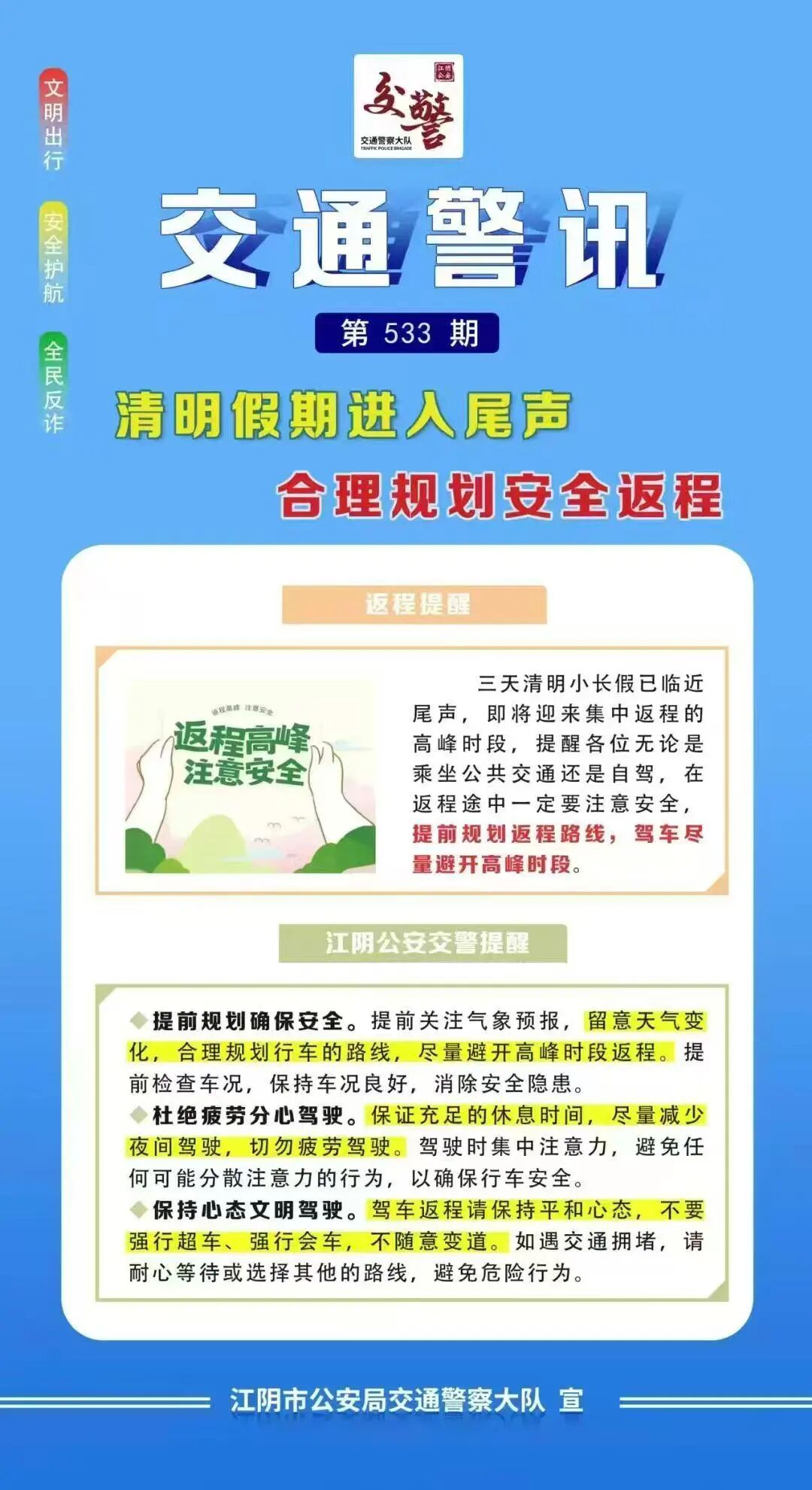 广大驾驶员要时刻关注最新路况,合理规划返程时间、路线,谨慎驾驶,平安出行。