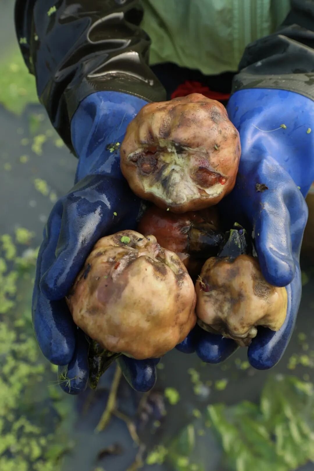 再顺着茎秆摸到水下的蒲头