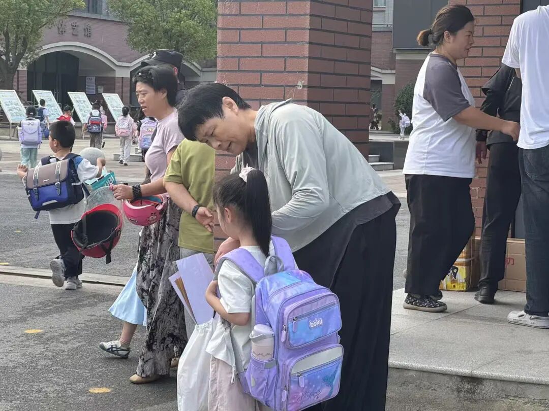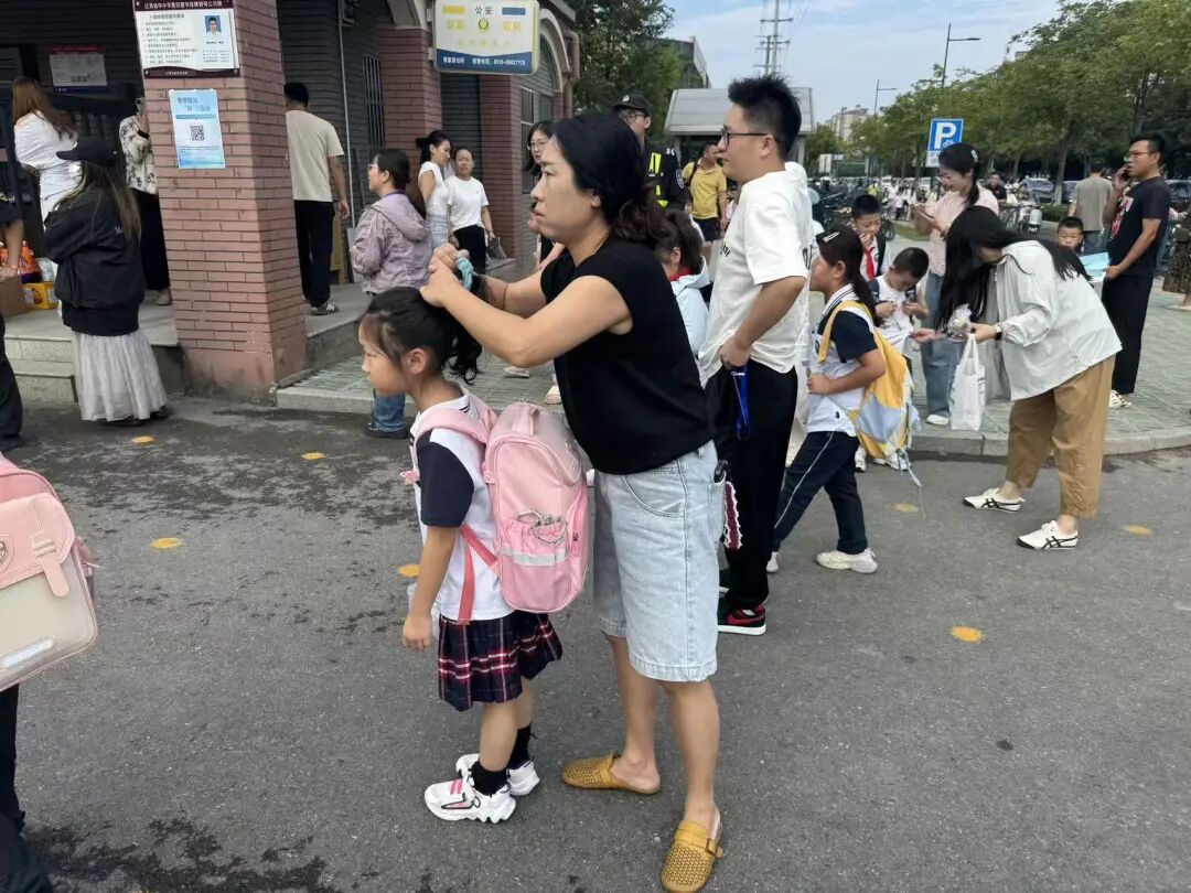 妈妈抬手理了理孩子歪着的书包带