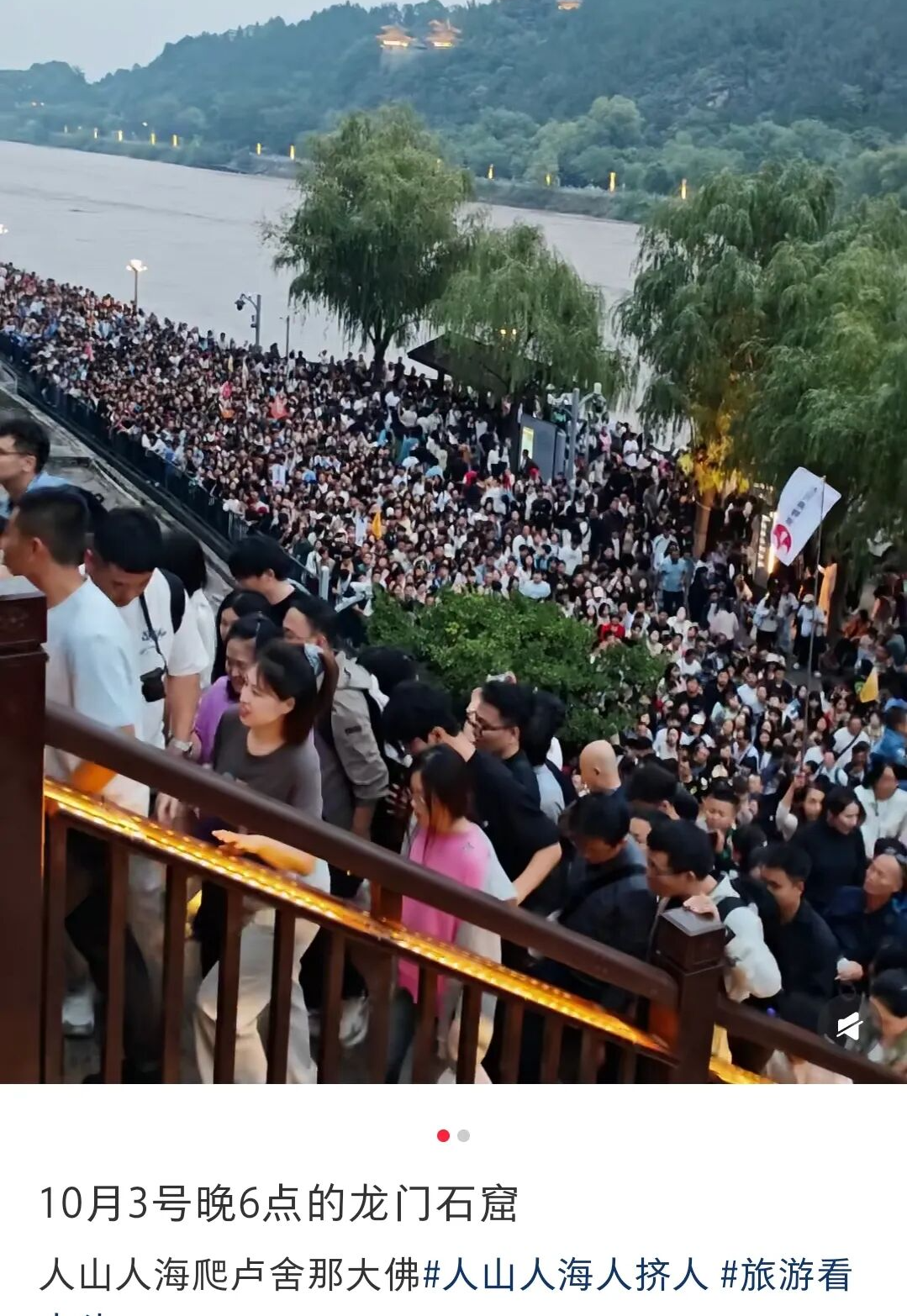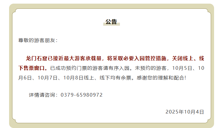 10月4日,洛阳龙门石窟官微公告:龙门石窟已接近最大游客承载量,将采取必要入园管控措施,关闭线上、线下售票窗口。而这已经是景区长假连续第三天发布人流量公告。