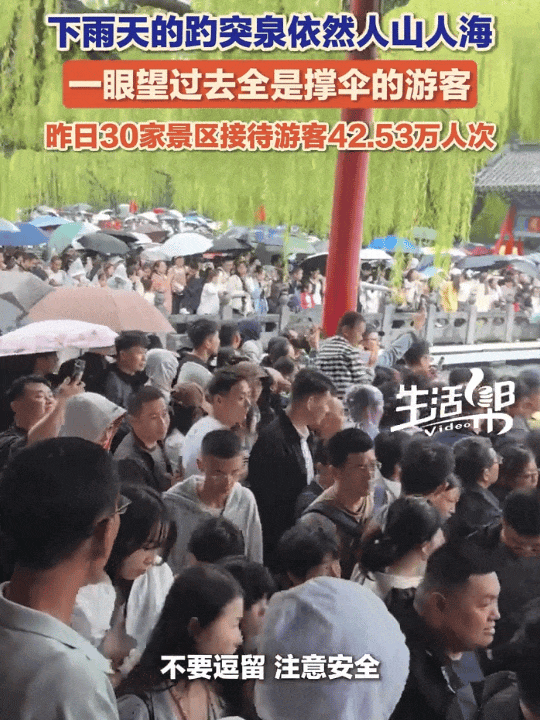 不少人想趁着假期去看看课文里的趵突泉。即使当地下起了雨,依然无法阻挡游客的热情,景区游客多到一眼望不到头。有网友表示,挤进去瘦两斤,挤出来瘦三斤。