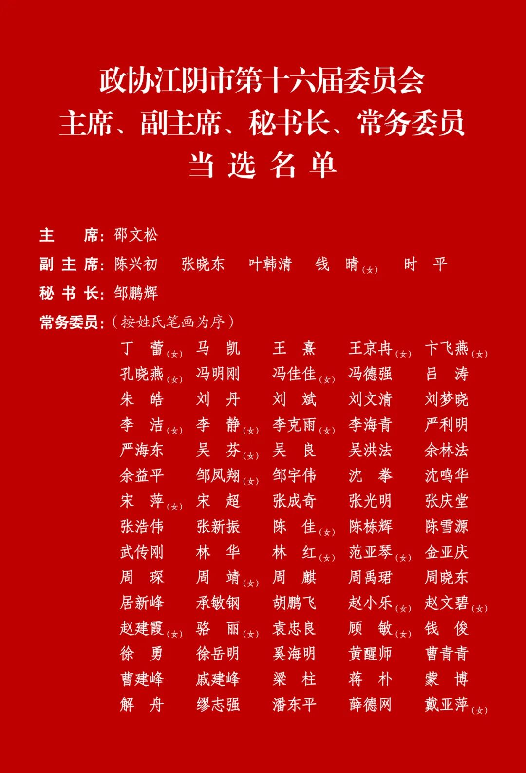 政协江阴市第十六届委员会第一次会议闭幕会前举行了选举大会,经全体委员会议选举产生了政协江阴市第十六届委员会主席、副主席、秘书长和常务委员。