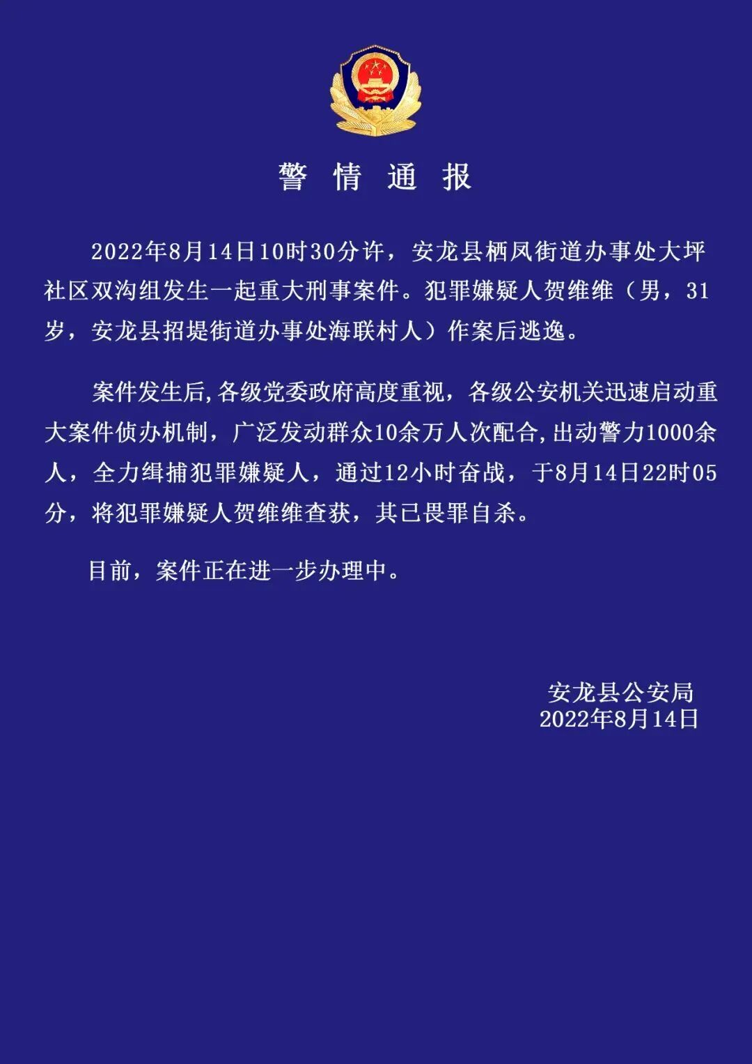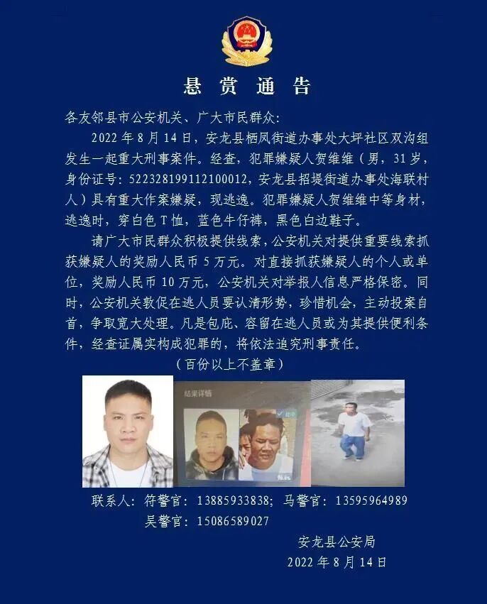 8月14日上午,贵州省安龙县发生一起重大刑案,犯罪嫌疑人作案后逃逸。当晚,警方将嫌疑人查获,但其已畏罪自杀。8月15日凌晨,贵州省安龙县公安局发布警情通报称,14日10时30分许,该县栖凤街道办事处大坪社区双沟组发生一起重大刑事案件。犯罪嫌疑人贺某某(男,31岁)作案后逃逸。