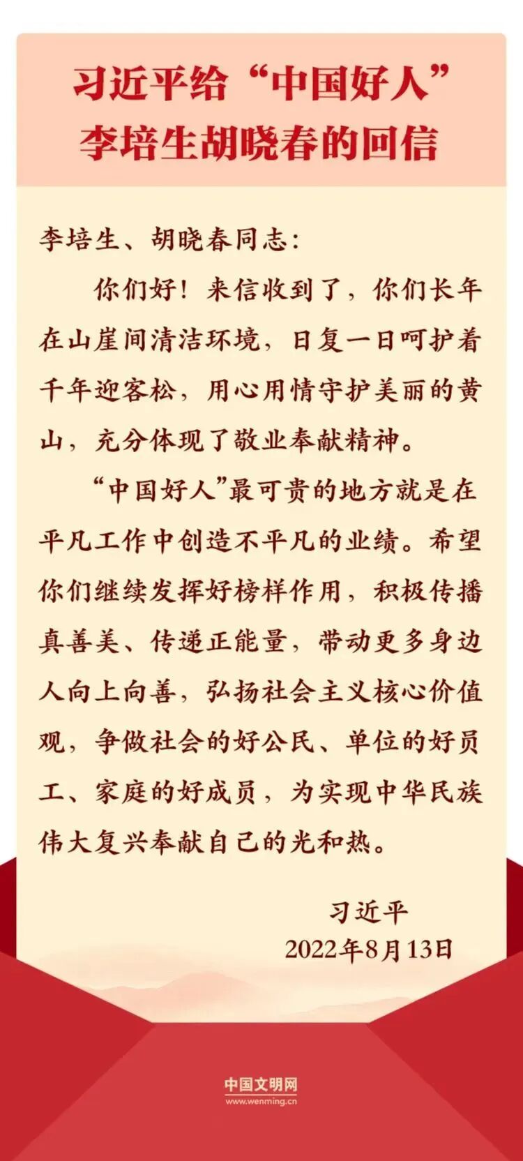 8月13日,中共中央总书记、国家主席、中央军委主席习近平给安徽黄山风景区工作人员李培生、胡晓春回信,对他们继续发挥“中国好人”榜样作用提出殷切期望。