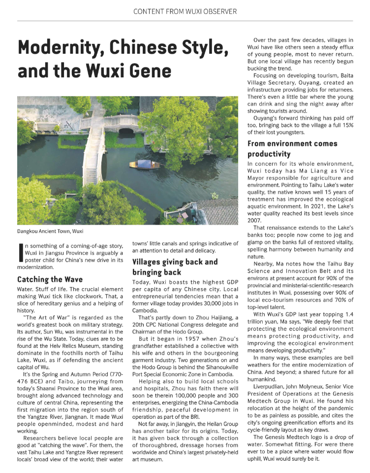 就像《时代》周刊对这张照片定义为“改变我们看待世界、乃至未来的影像”一样,本期《时代》周刊同样有一篇介绍中国最新动态的文章,作者将观察对准了中国东部城市无锡,试图从这座江南城市解读中国式现代化基因,也许读完这篇文章,会让西方读者更真切地感受“中国式现代化”和这句标语所倡导的发展方式。