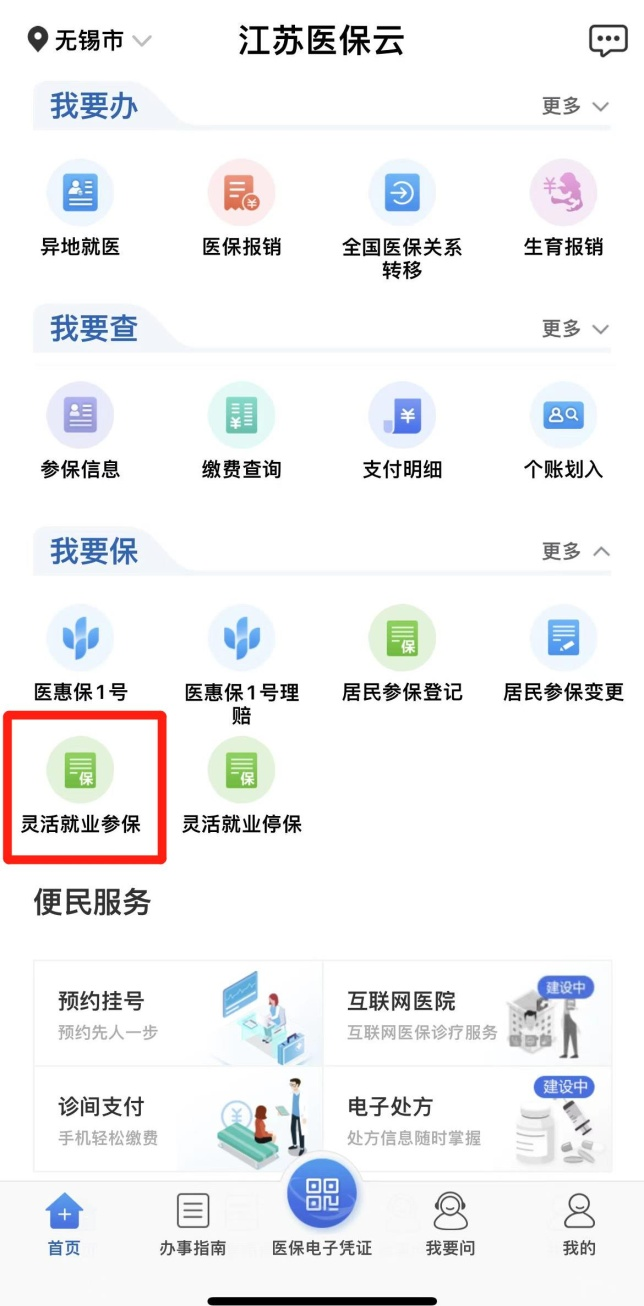 (1)应用商店或App Store搜索下载“江苏医保云”,注册后登录,选择“我要保”-“灵活就业参保”。