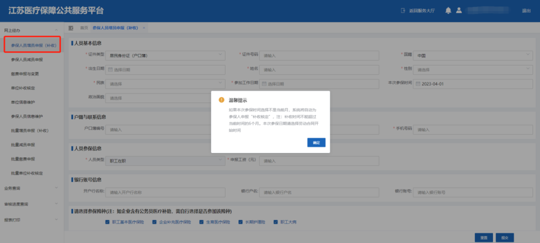 ②输入职工基本信息,“本次参保时间”请选择参保人劳动合同开始月份,如本次参保时间选择不是当前月,系统将自动为参保人申报“补收核定”,“参加工作日期”早于“本次参保时间”即可,确认信息无误后,申报提交。