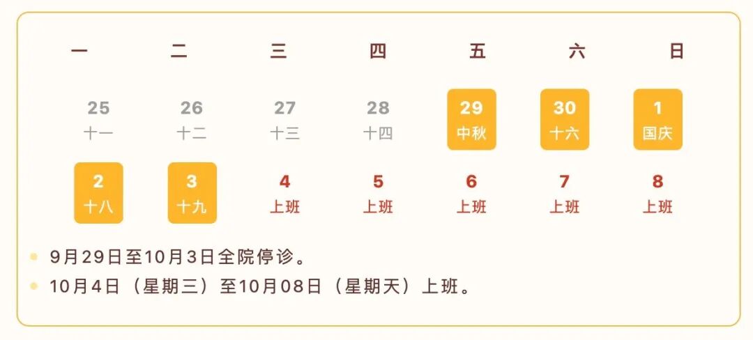 9月29日(周五)-10月6日(周五)门诊正常开展诊疗服务,