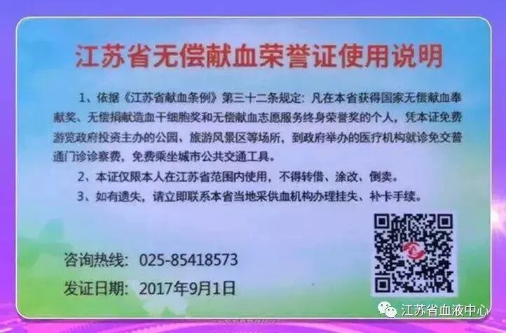 “三免卡”全称为“江苏省无偿献血荣誉证”,颁发给在本省获得“国家无偿献血奉献奖”“无偿捐献造血干细胞奖”“无偿献血志愿服务终身荣誉奖”的个人。